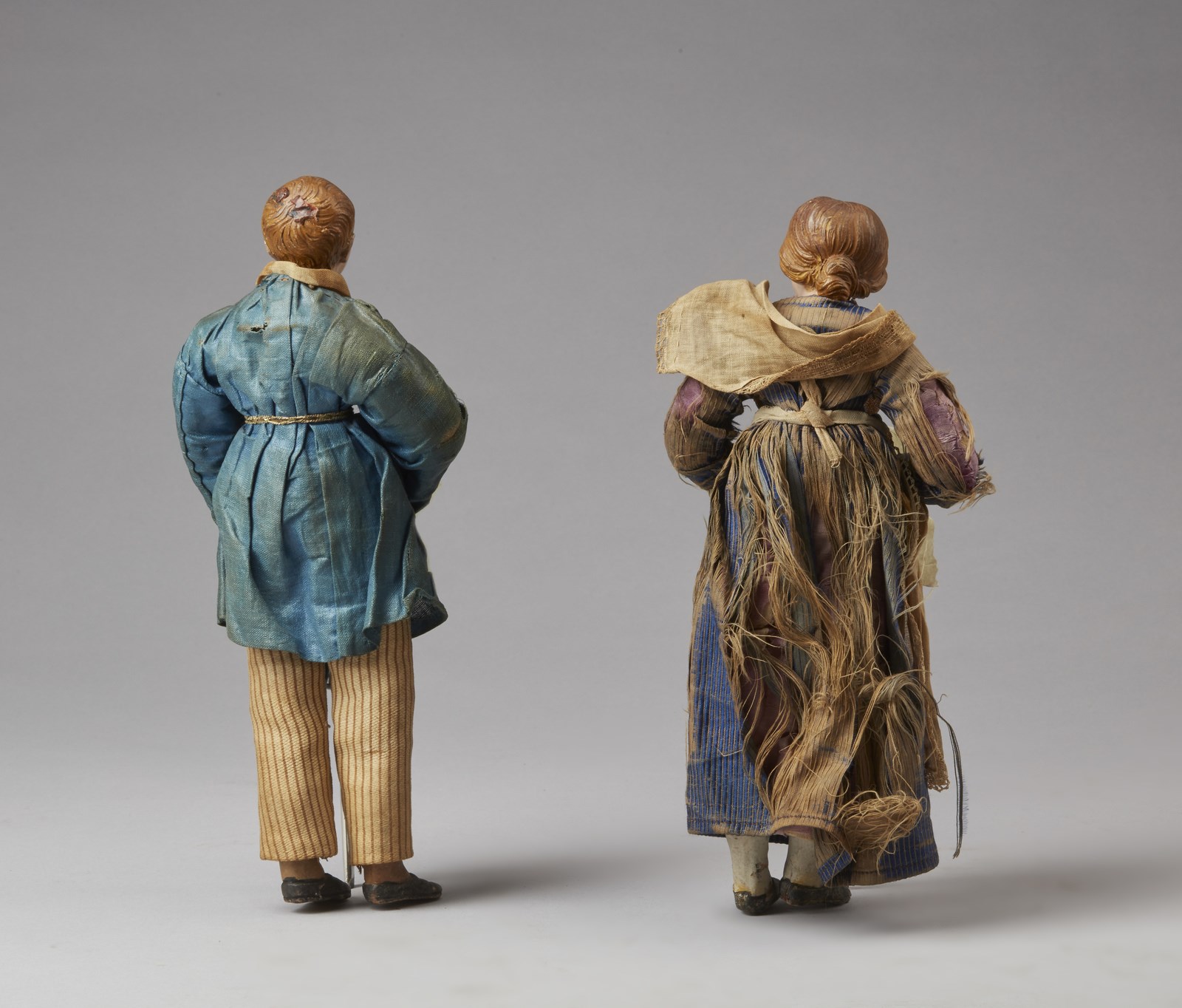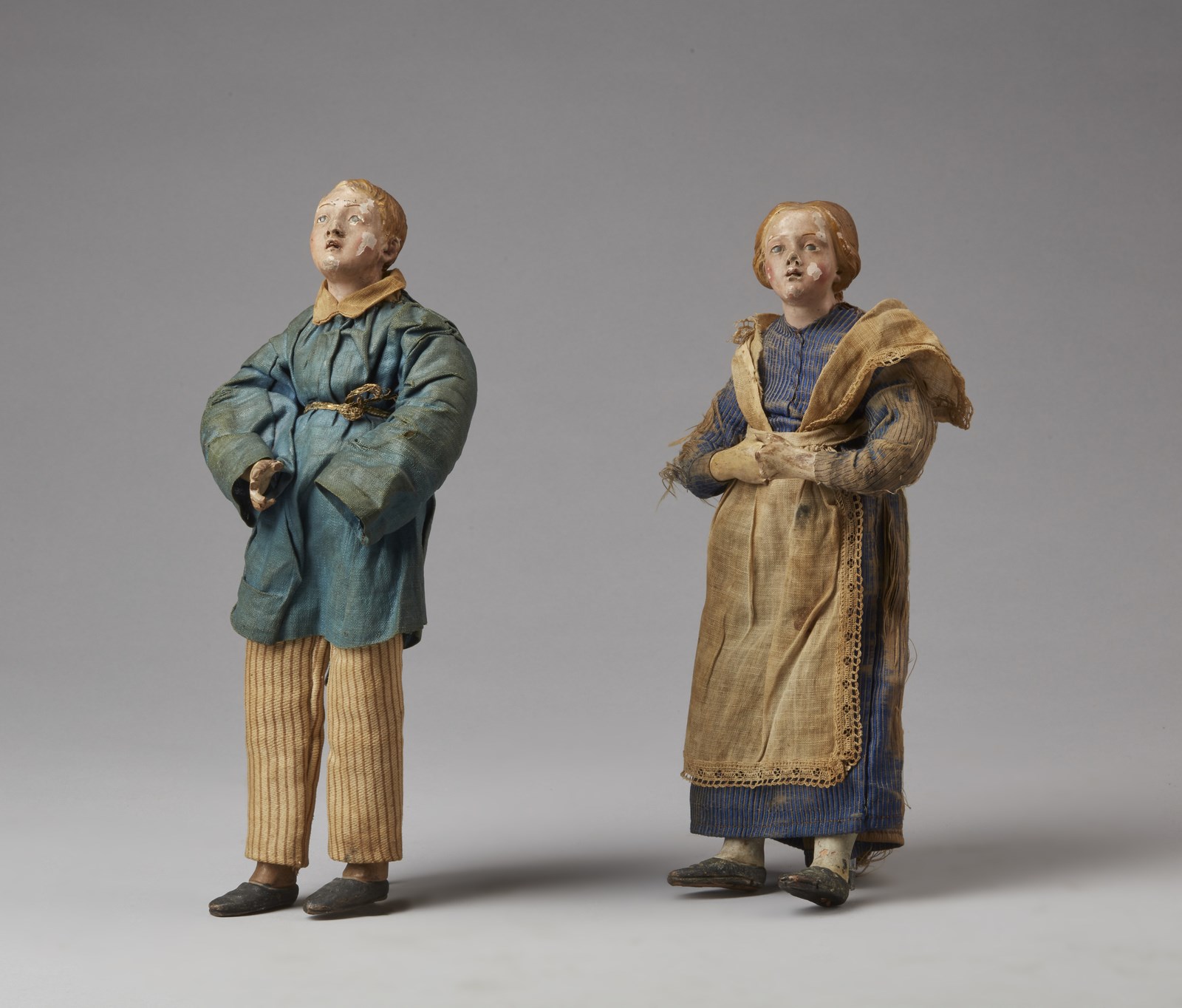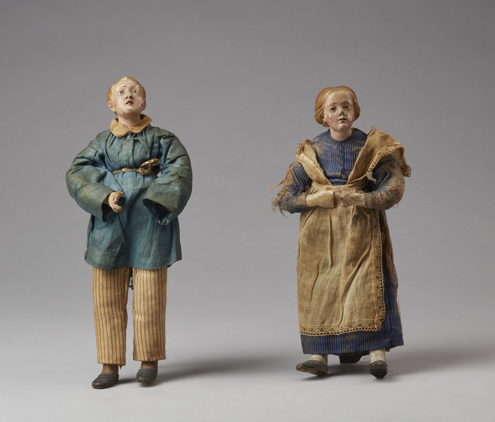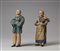 MANIFATTURA NAPOLETANA DEL XIX SECOLO - Coppia di personaggi del presepe napoletano in terracotta policroma e tessuto.