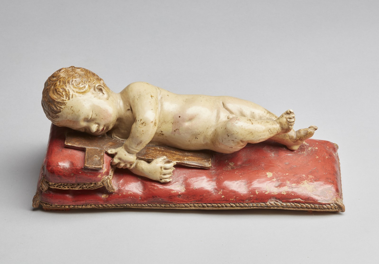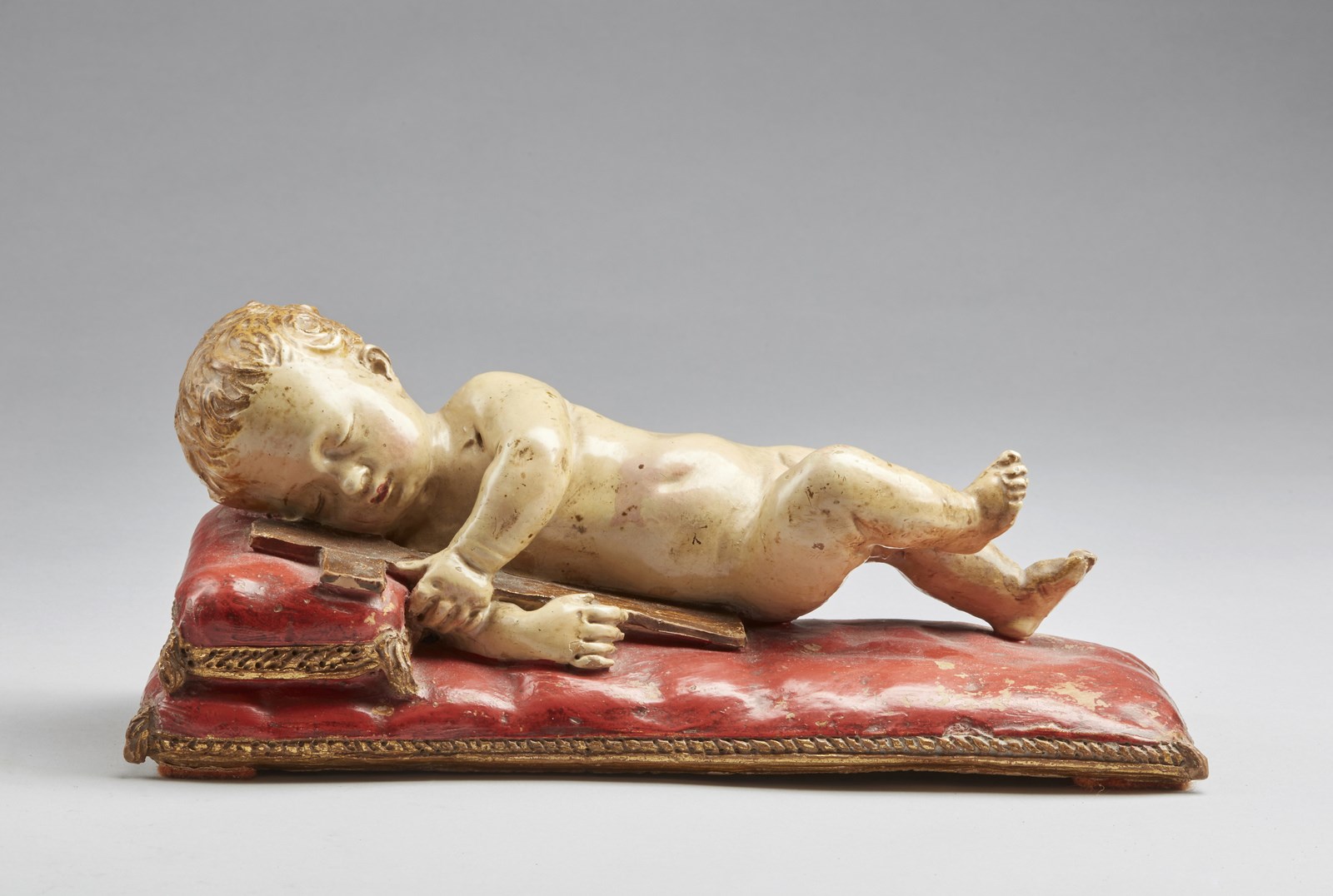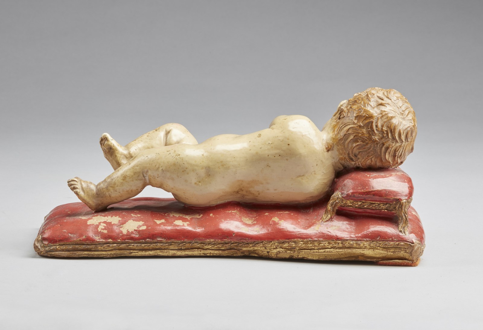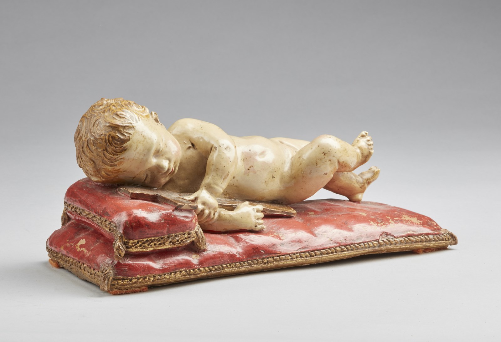PLASTICATORE ITALIANO DEL XIX SECOLO - Scultura in terracotta policroma raffigurante Gesù Bambino dormiente.