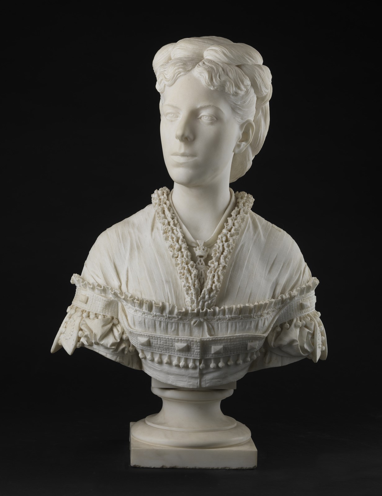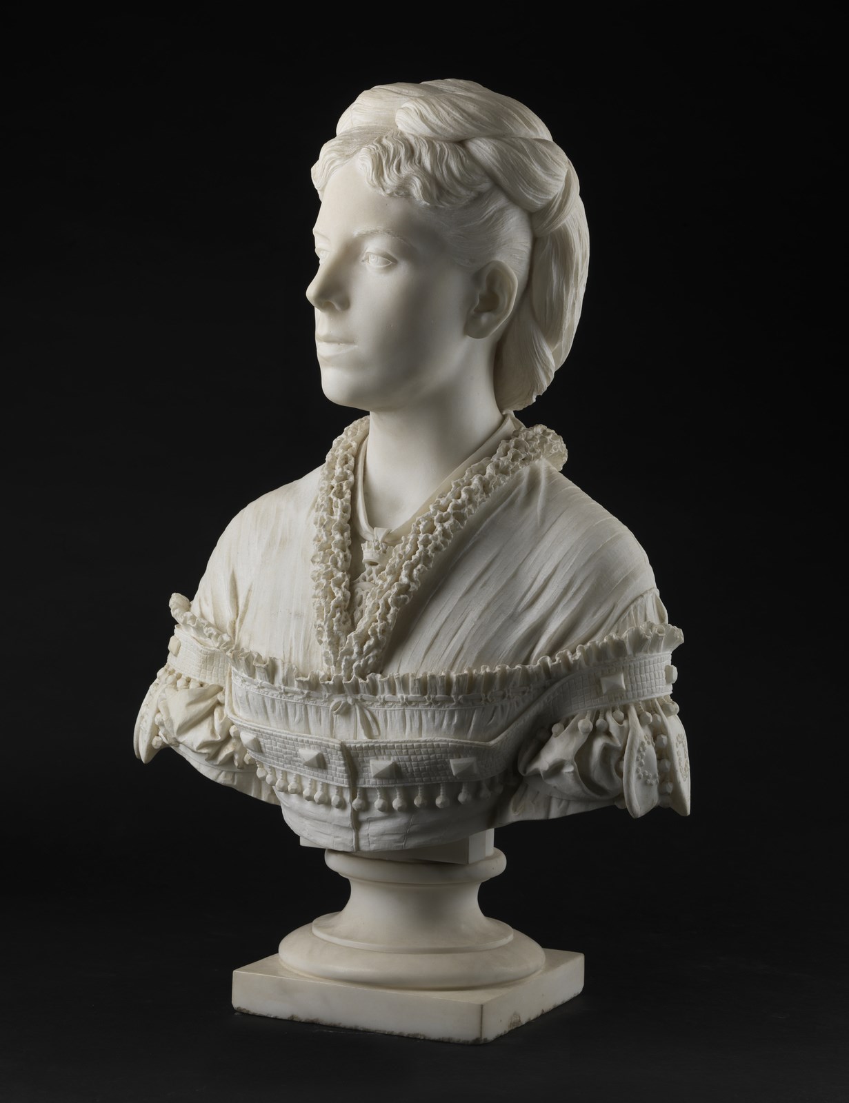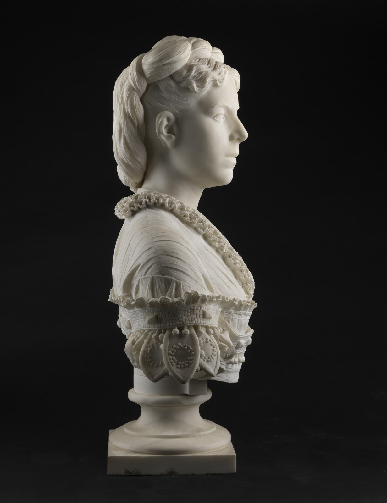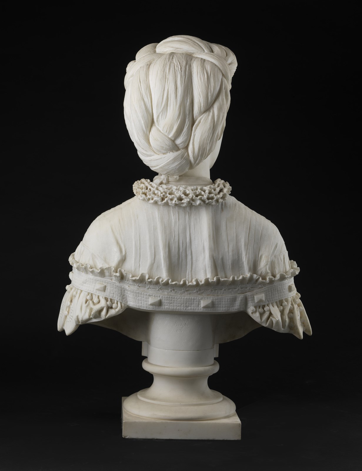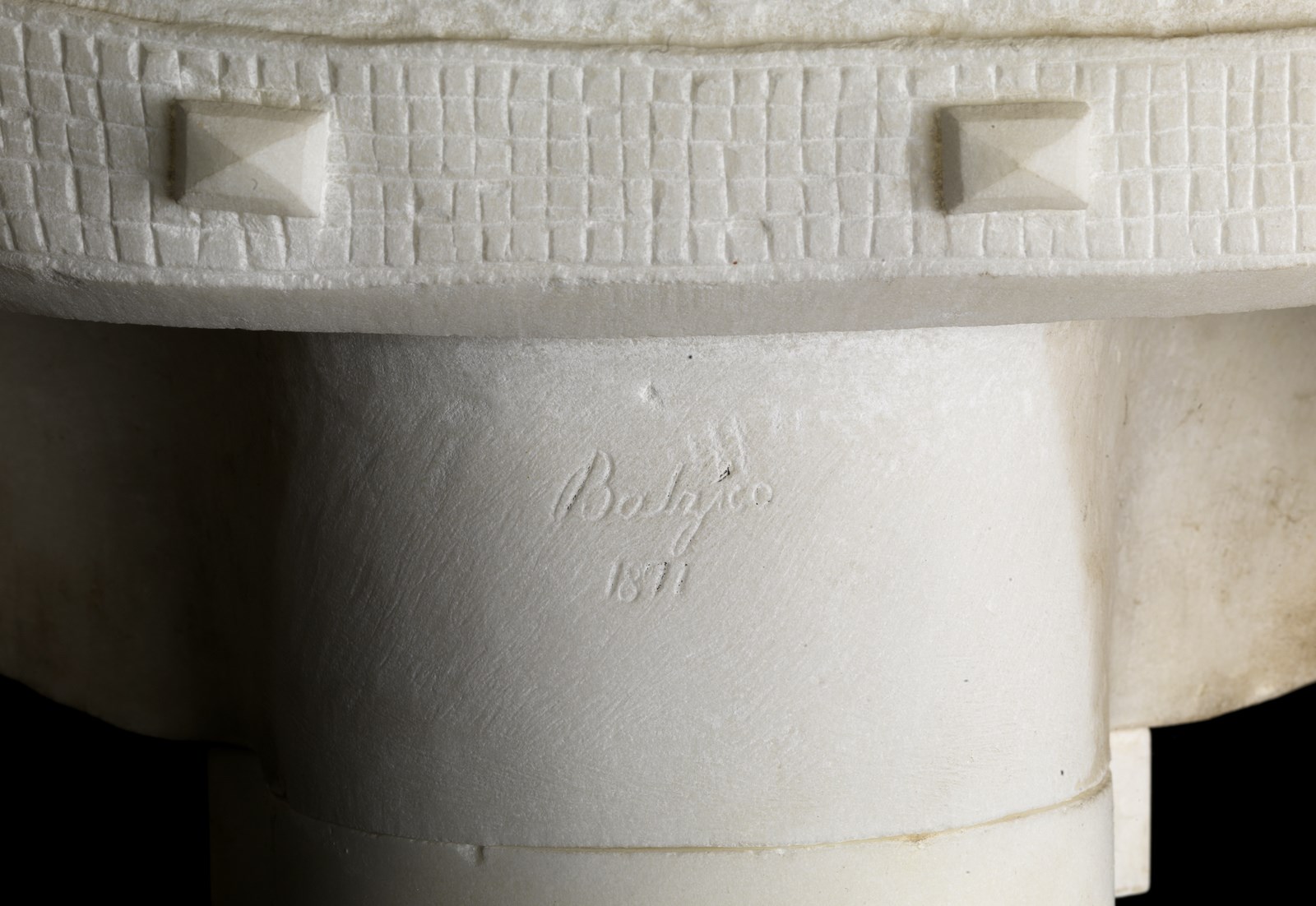 Originario di Cava dei Tirreni, Alfonso Balzico iniziò il suo percorso artistico presso l'Accedemia di Belle Arti di Napoli sotto l'egida di Tito Angelini, con successivi soggiorni a Roma, Milano e Firenze. Artista di formazione neoclassica, mutò presto il suo stile adattandolo in senso romantico e realista. Nel 1863, su iniziativa del Re d'Italia Vittorio Emanuele II, si trasferì a Torino, dove, tre anni dopo, assunse la carica di "Scultore della Casa Reale". Sue opere vennero esposte in occasione di alcune rassegne artistiche nazionali, come quella organizzata dalla Società Promotrice delle Belle Arti di Torino del 1868. Tra le sue sculture più note, la celebrata "Cleopatra", conservata alla Galleria Nazionale di Roma, il monumento equestre a Vittorio Emanuele II in piazza Giovanni Bovio a Napoli (su disegno di Emilio Franceschi) e la statua di Flavio Gioia nell'omonima piazza ad Amalfi, opera che venne premiata nel 1900 con la medaglia d'oro all'Esposizione Universale di Parigi. Questo busto di gentildonna, datato 1871 e quindi riferibile al periodo torinese dell'attività di Balzico come Scultore Reale (prima del trasferimento a Napoli e poi a Roma nel 1875), ritrae probabilmente un'aristocratica della corte sabauda, avvolta in un elegante abito decorato, il cui bordo di pizzo è reso con maestria nel marmo, così come i dettagli del corpetto e dell'onorificenza al collo.