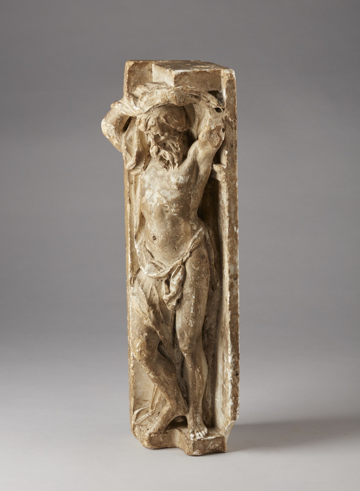 La tecnica esecutiva e la tipologia di questo Telamone, probabilmente un modello in scala ridotta per una realizzazione in stucco per la decorazione di un edificio ecclesiastico o di una dimora nobiliare, possono essere ricondotti all'ambito di Antonio Trentanove, scultore e stuccatore italiano nativo di Rimini e attivo tra la seconda metà del XVIII secolo e i primi anni dell'800 in Emilia Romagna, Marche e Toscana. Per un confronto con dei telamoni certamente attribuiti all'artista, si vedano le sculture in stucco nella cantoria della Chiesa di S. Maria dei Servi a Rimini.