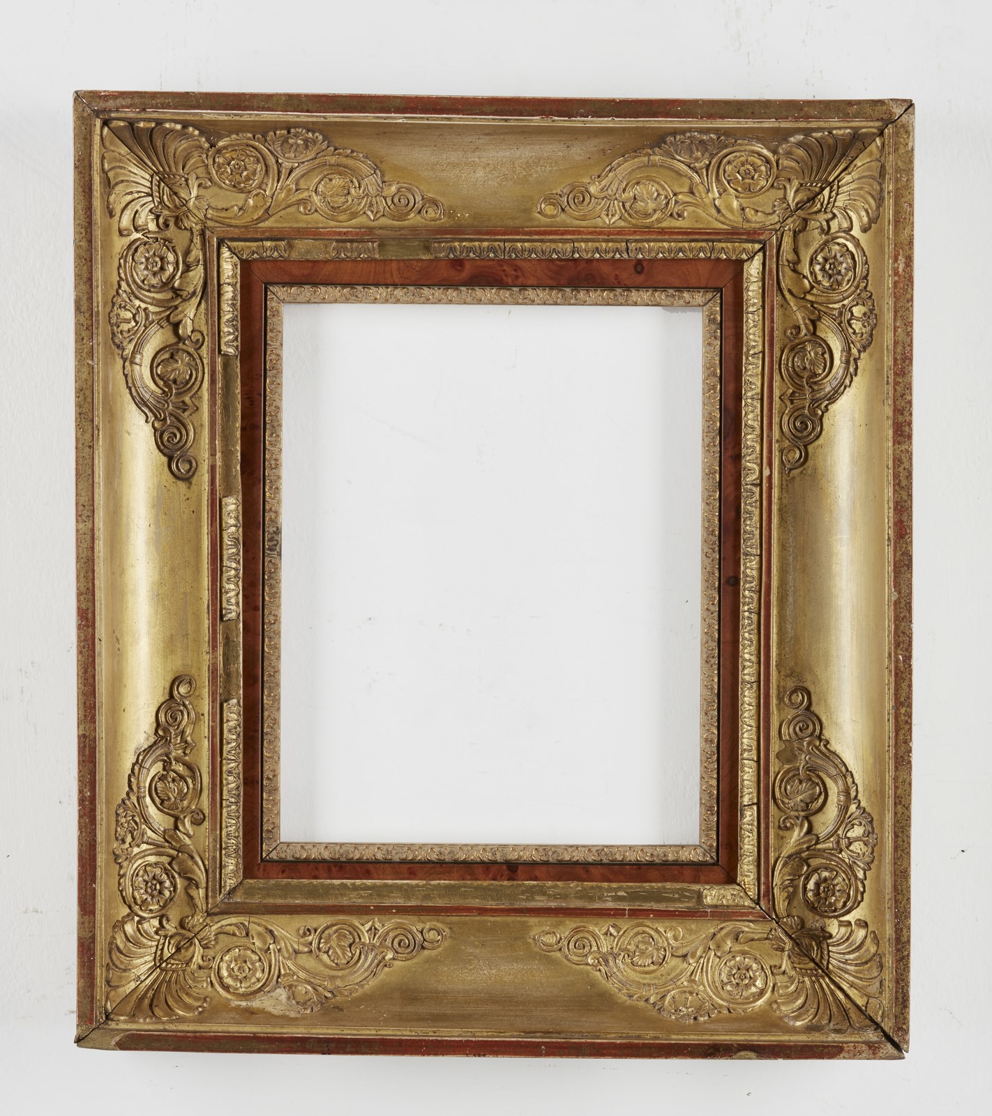 MANIFATTURA FRANCESE DEL XIX SECOLO - Piccola cornice in stile Carlo X in legno dorato con fregi fitomorfi agli angoli.