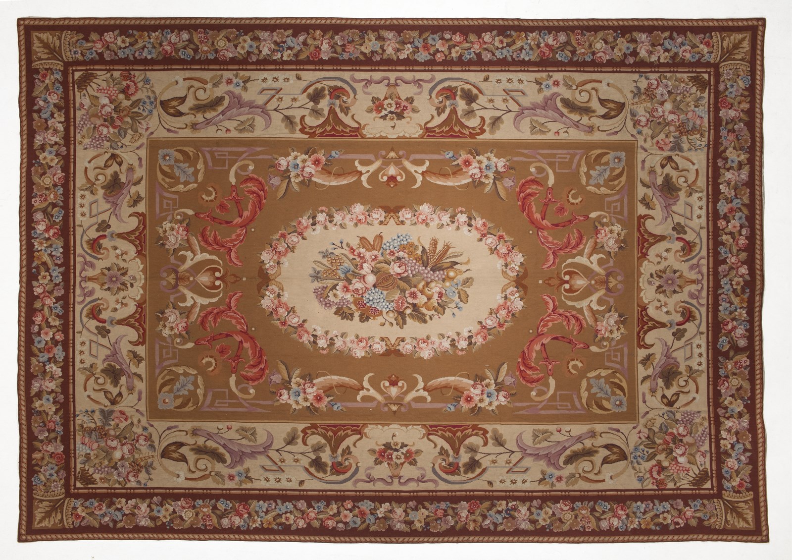 MANIFATTURA FRANCESE DEL XX SECOLO Tappeto a piccolo punto in stile Aubusson, medaglione centrale su tono crema in campo bruno, decori vegetali e floreali. . Cm 285,00 x 404,00.