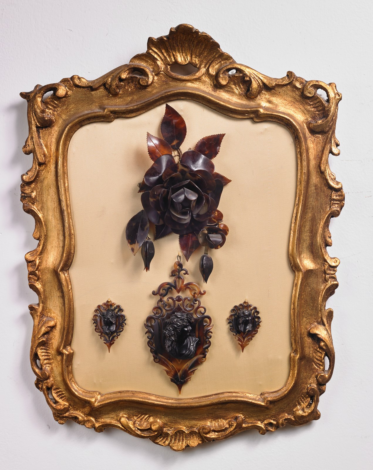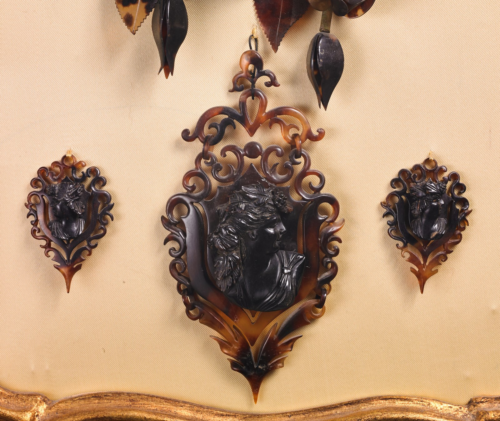 La parure, realizzata in preziosa tartaruga scura mirabilmente intagliata, è composta da una spilla a forma di rosa aperta circondata da foglie e boccioli penduli, un pendente di collana ed una coppia di pendenti di orecchini a cammeo, decorati da sinuosi ramages stilizzati.