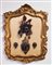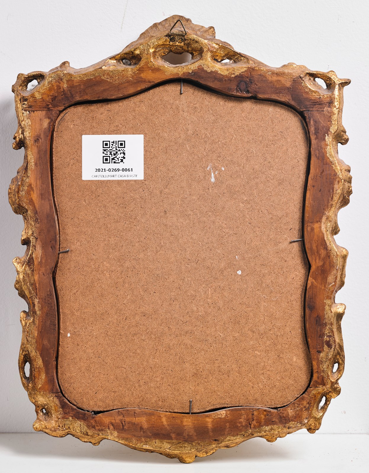 La parure viene presentata appesa su un fondo di tessuto neutro color crema, entro una ricca cornice in legno dorato ed intagliato di gusto settecentesco.