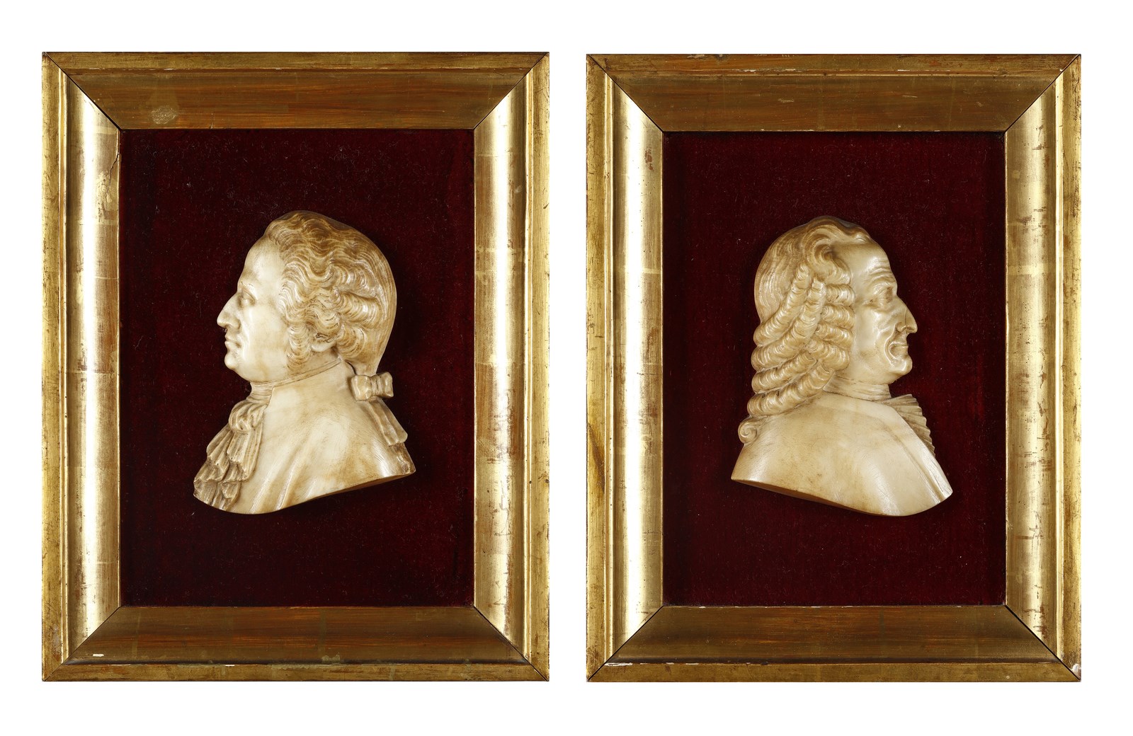 ARTISTA DEL XIX SECOLO - Coppia di ritratti in alabastro su base in velluto rosso. .