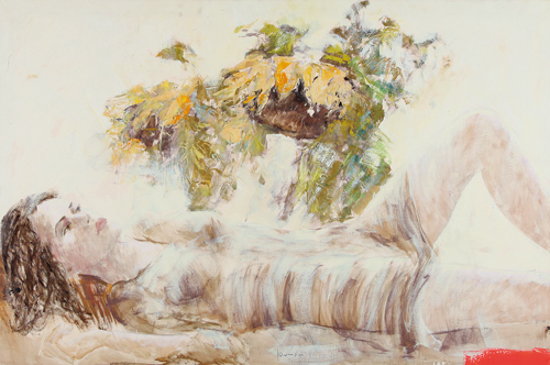 FRANCESCO GIACOMAZZI Codigoro 02/06/1956 Donna girasole olio su tela cm. 80x120, firma in basso al centro, titolo e firma al retro, opera priva di cornice.