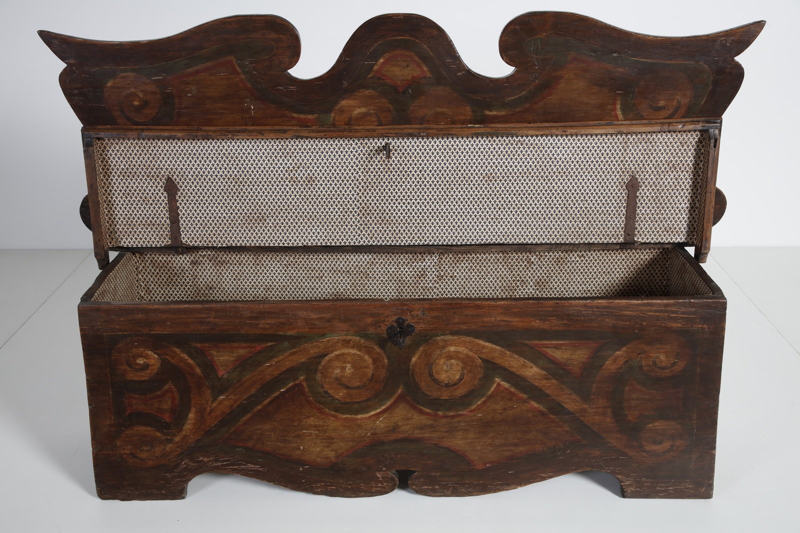 MANIFATTURA ITALIANA DEL XIX SECOLO - Cassapanca in legno di noce intagliato con schienale sagomato, decorata a festoni.