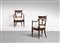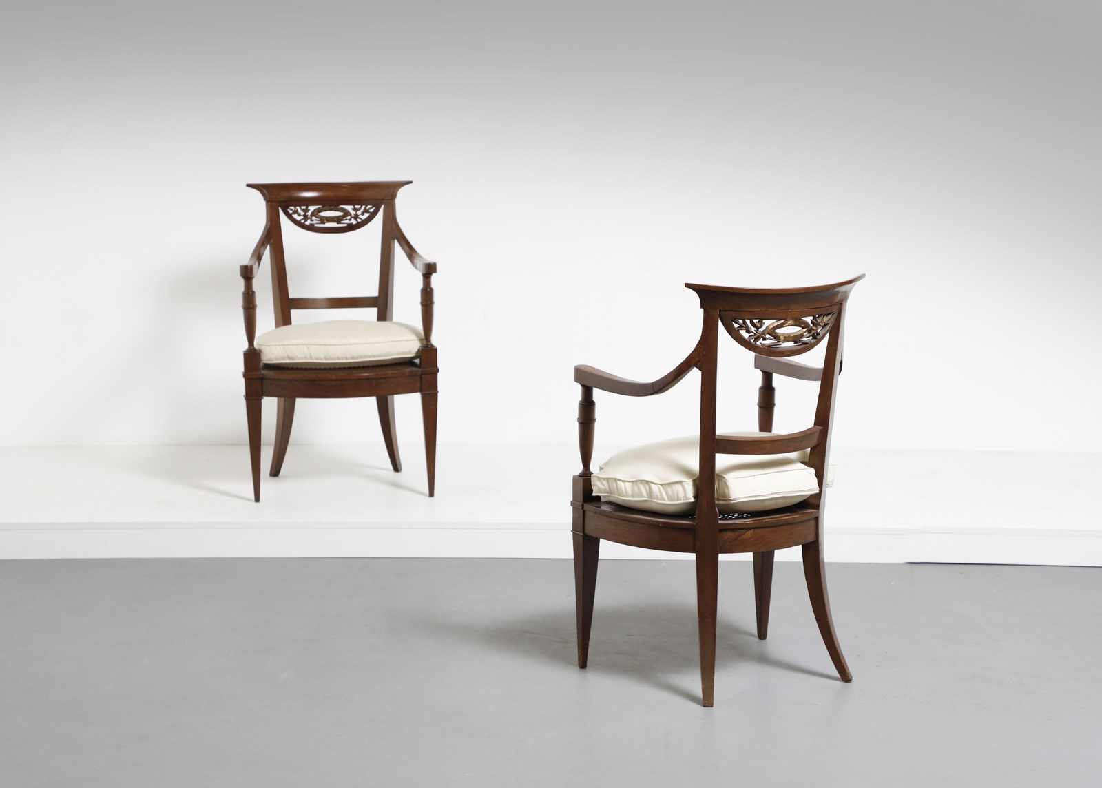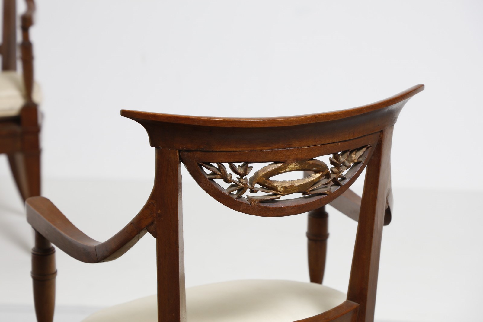 MANIFATTURA ITALIANA DEL XIX SECOLO - Coppia di poltrone in legno di noce, schienale a giorno parzialmente dorato, gambe a sciabola.