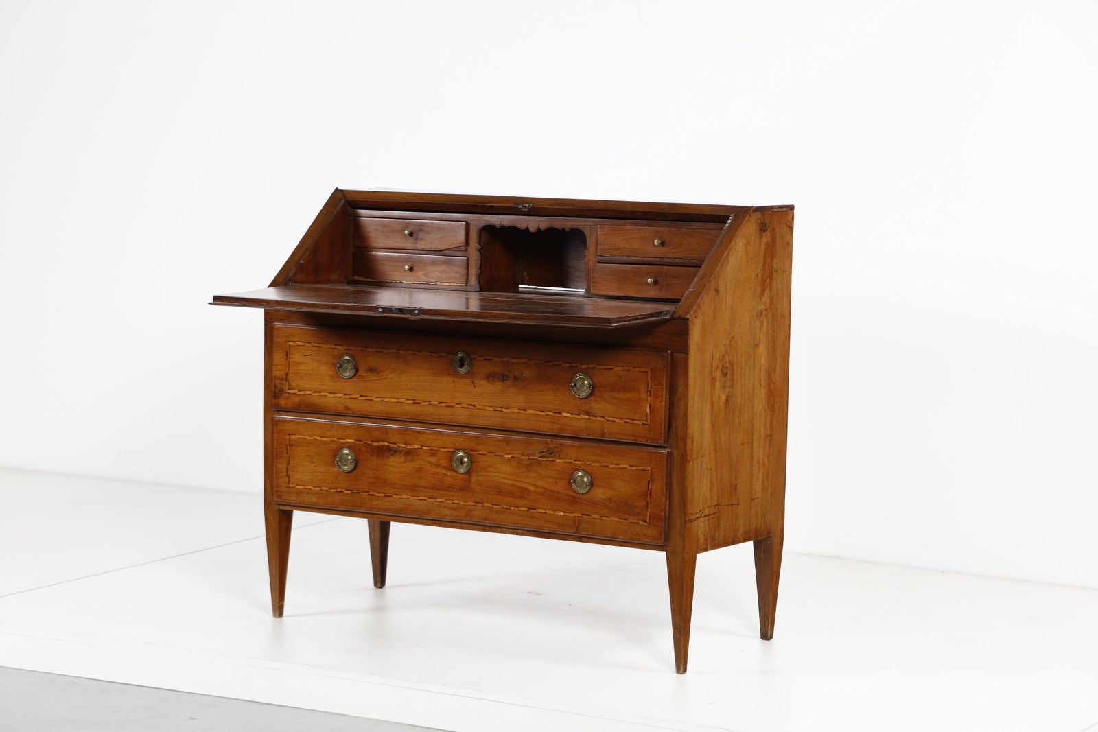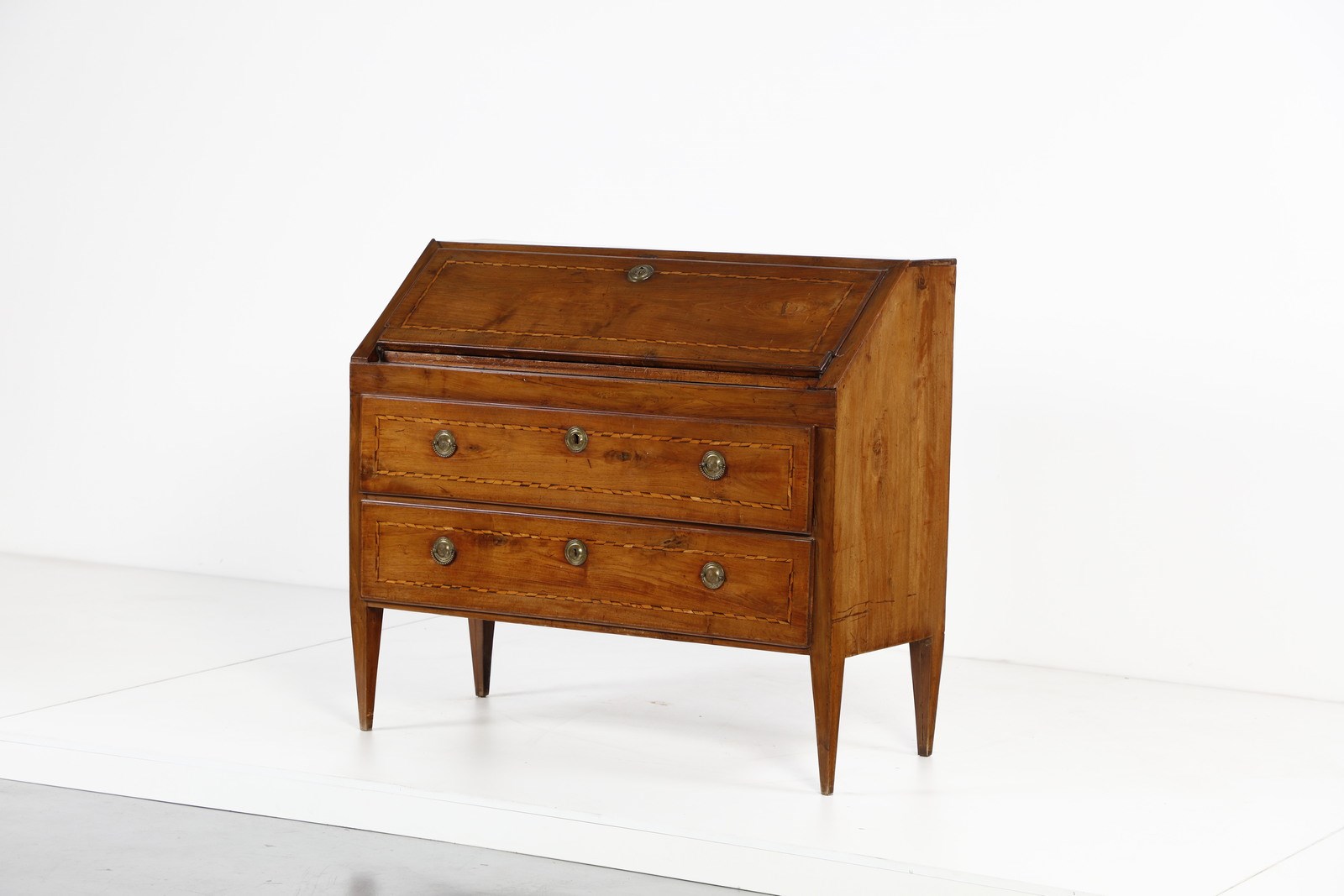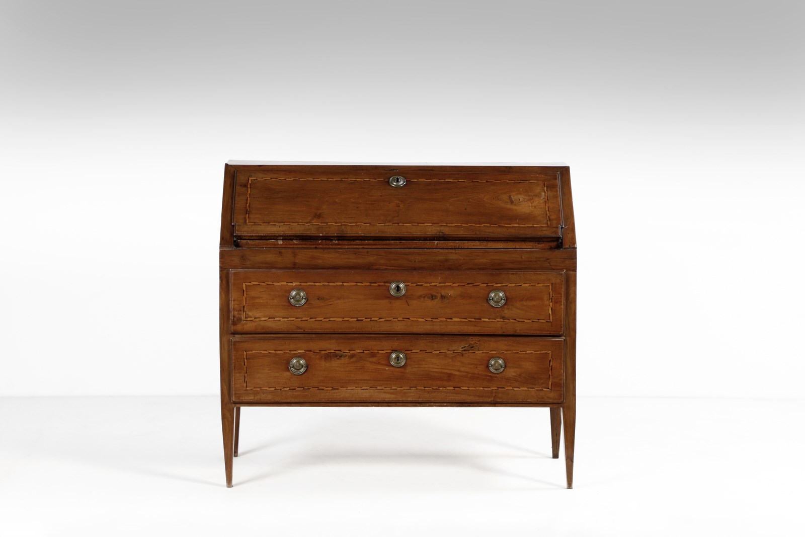 MANIFATTURA LOMBARDA DEL XIX SECOLO Cassettone a ribalta in noce, due cassetti sul fronte, gambe a piramide rovesciata. . Cm 119,50 x 106,00 x 52,50.