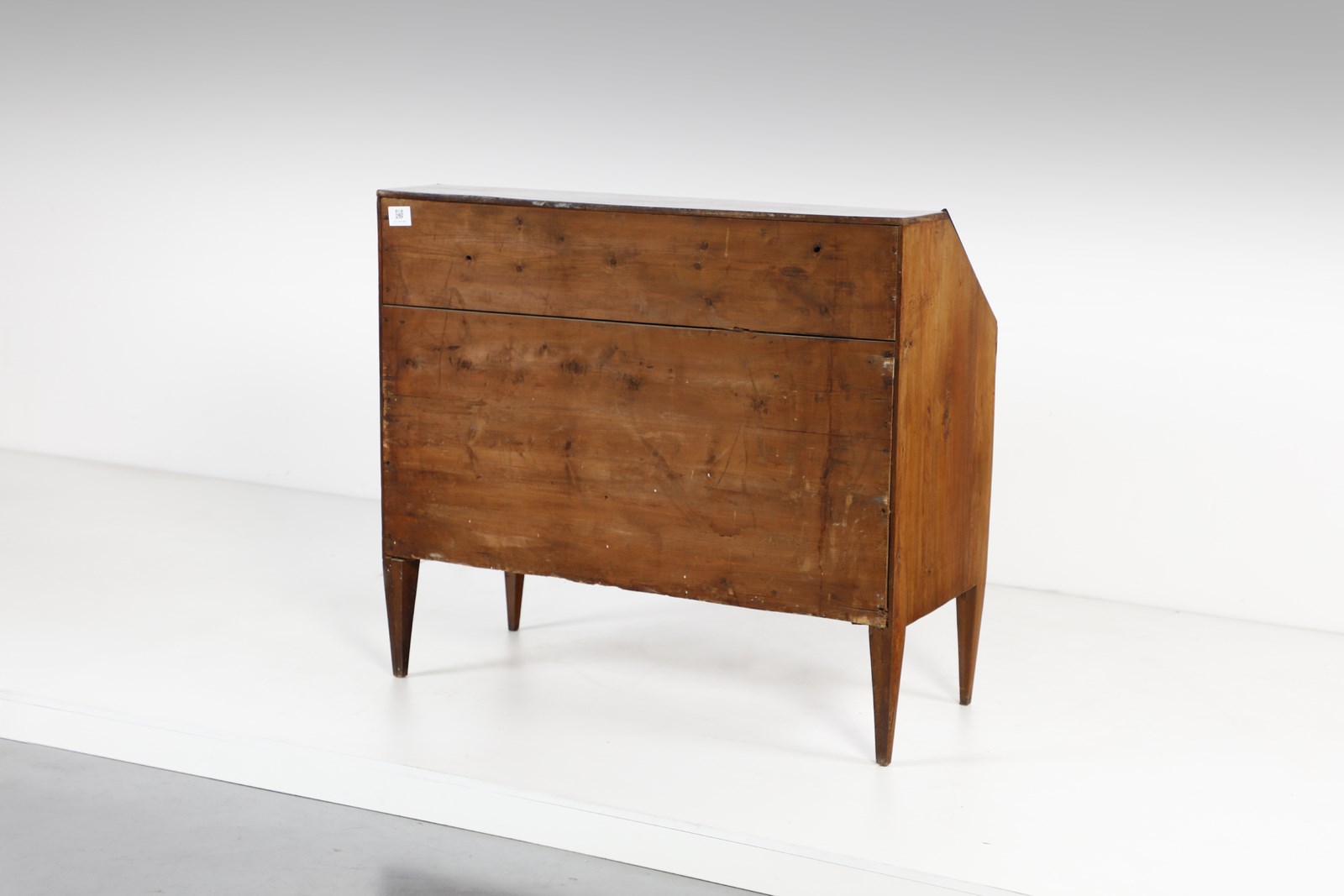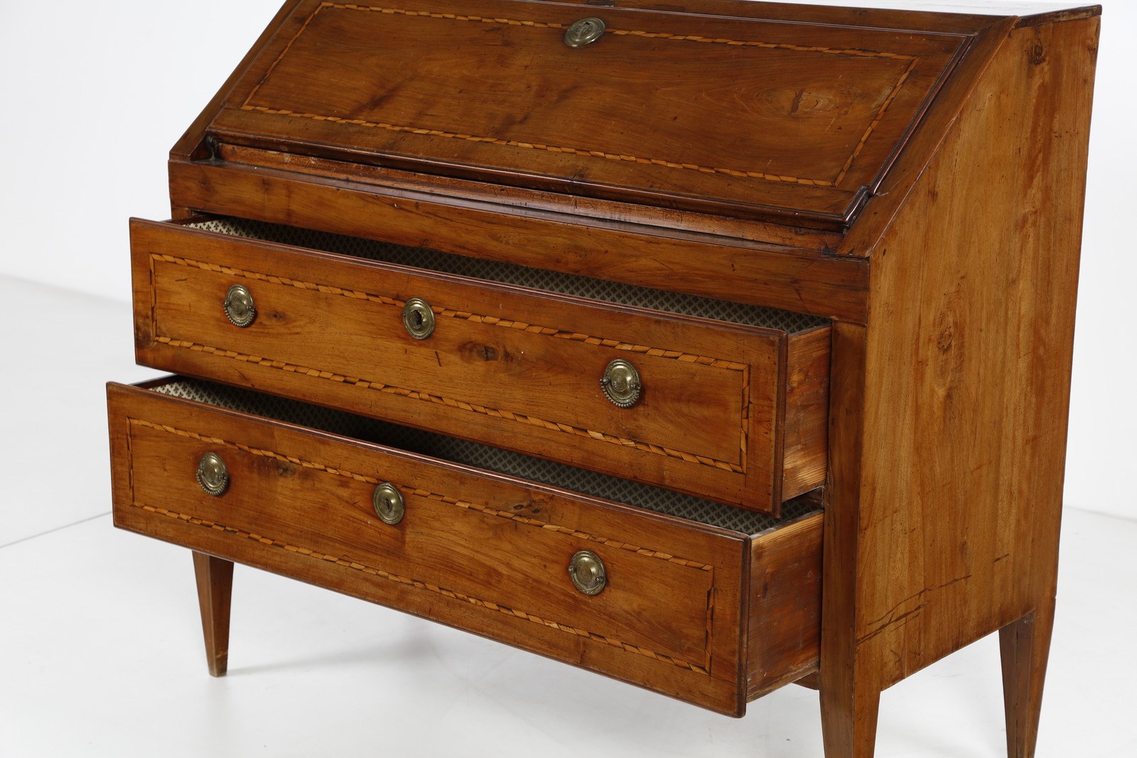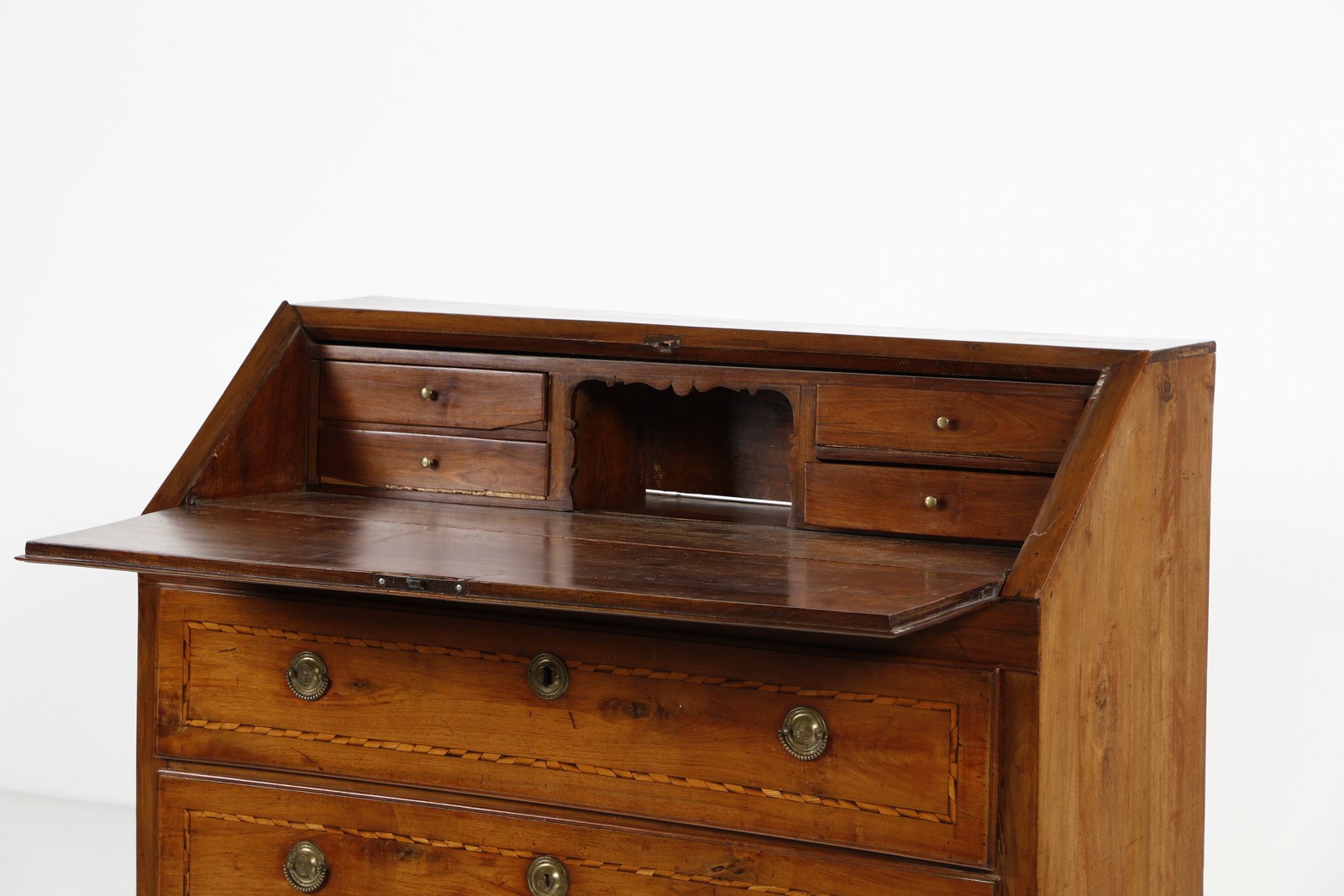 MANIFATTURA LOMBARDA DEL XIX SECOLO Cassettone a ribalta in noce, due cassetti sul fronte, gambe a piramide rovesciata. . Cm 119,50 x 106,00 x 52,50.