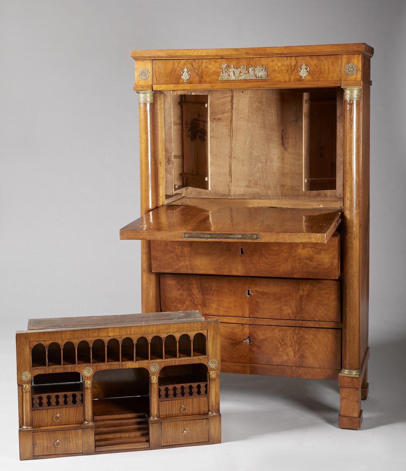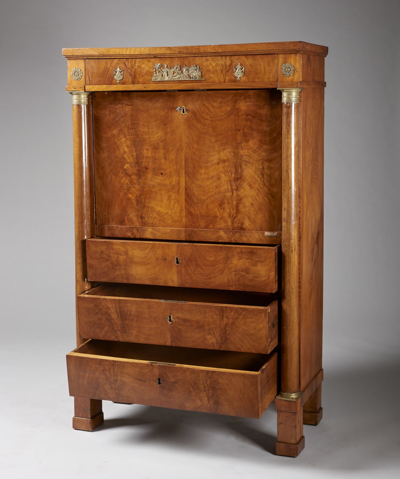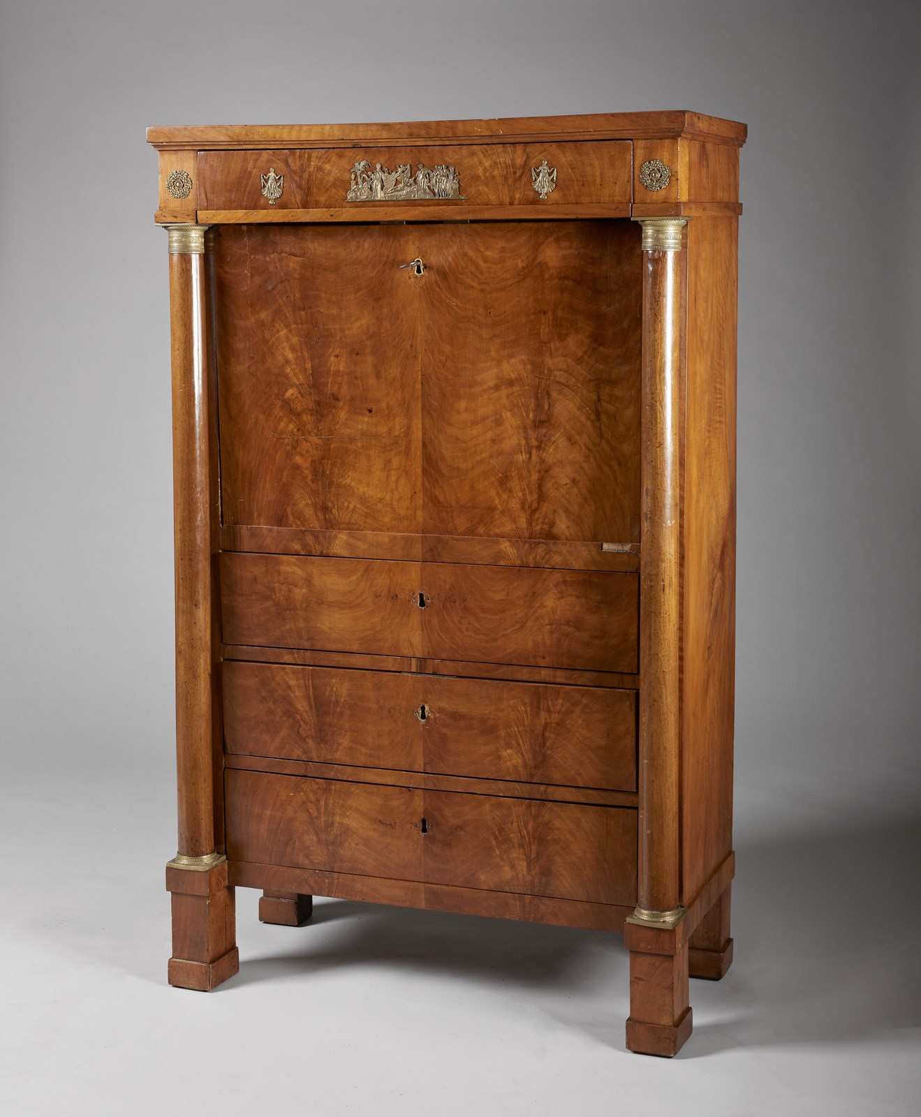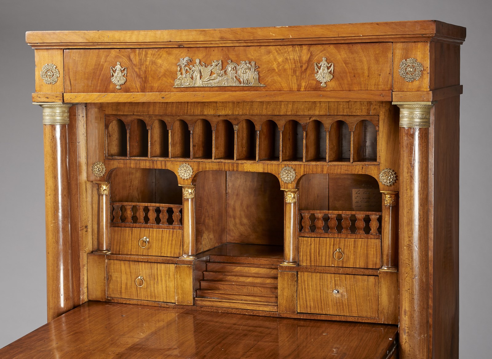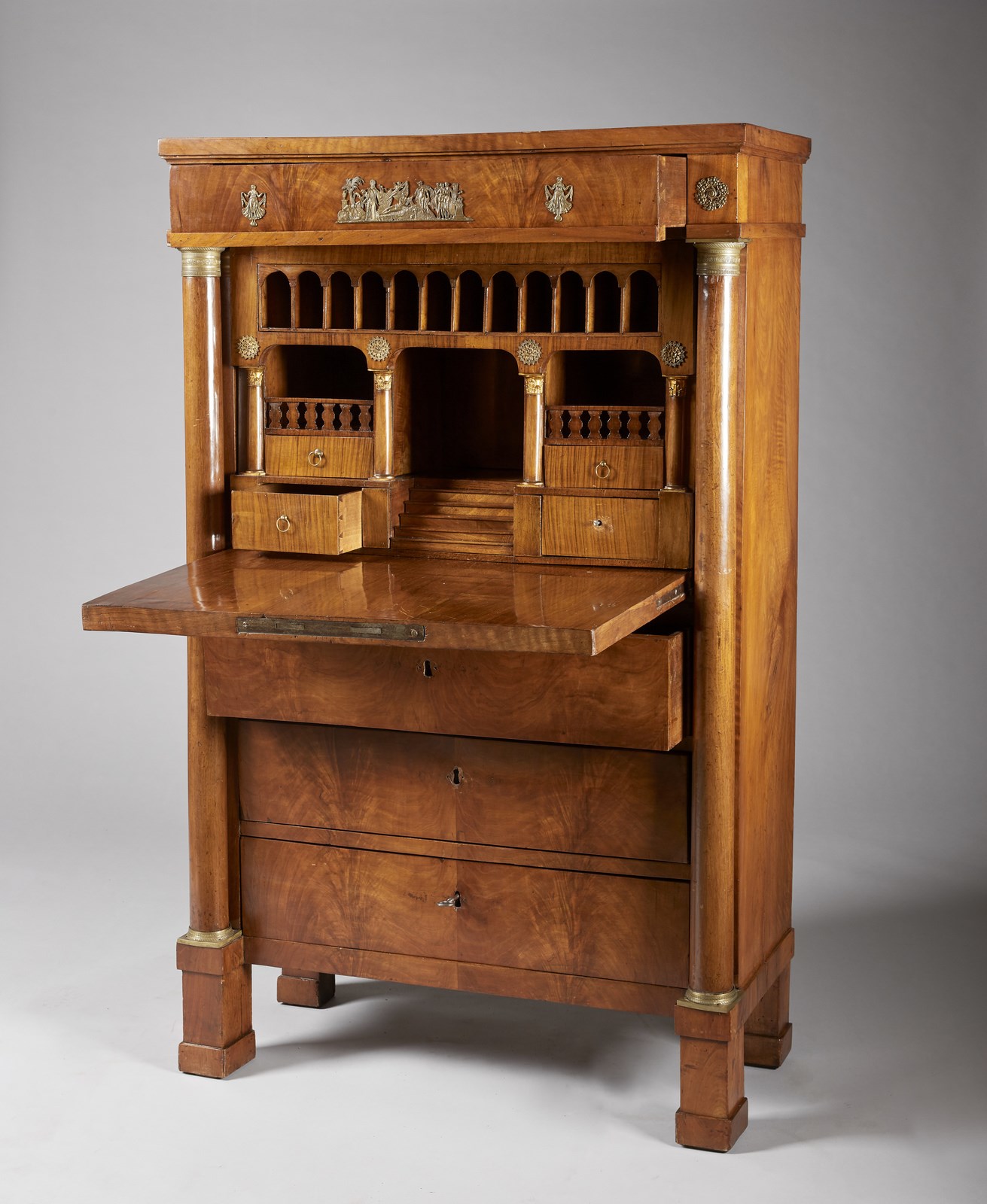 MANIFATTURA ITALIANA, PERIODO IMPERO Secretaire lastronato in legno di noce, calatoia con scarabattolo interno a quattro cassettini e arcatella con dodici vani, sostenuta da quattro colonne corinzie con capitelli dorati. Due colonne sugli spigoli con capitello in metallo dorato, tre cassetti e piedi a pilastro. . Cm 91,00 x 147,00 x 41,50.