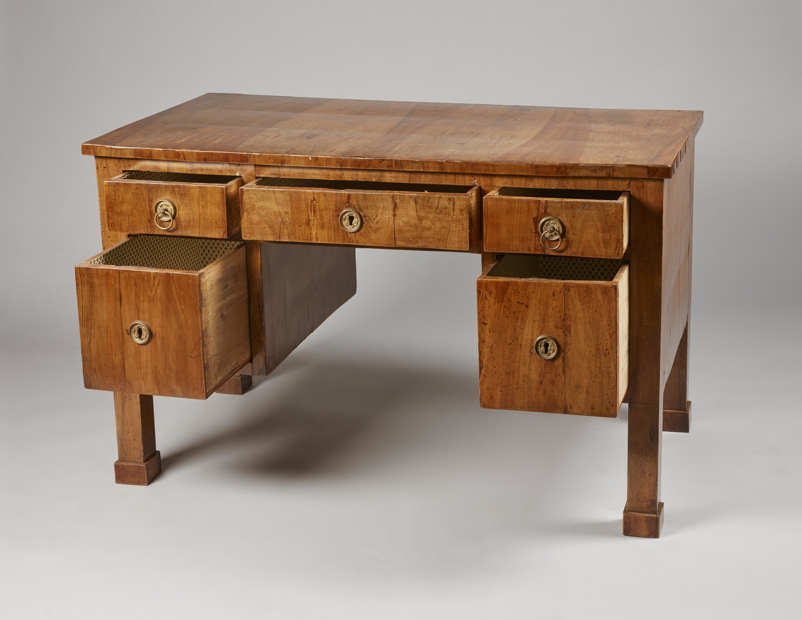MANIFATTURA DELL'ITALIA SETTENTRIONALE, SECOLO XIX - Scrittoio lastronato in noce a cinque cassetti sul fronte, piedi a pilastro.