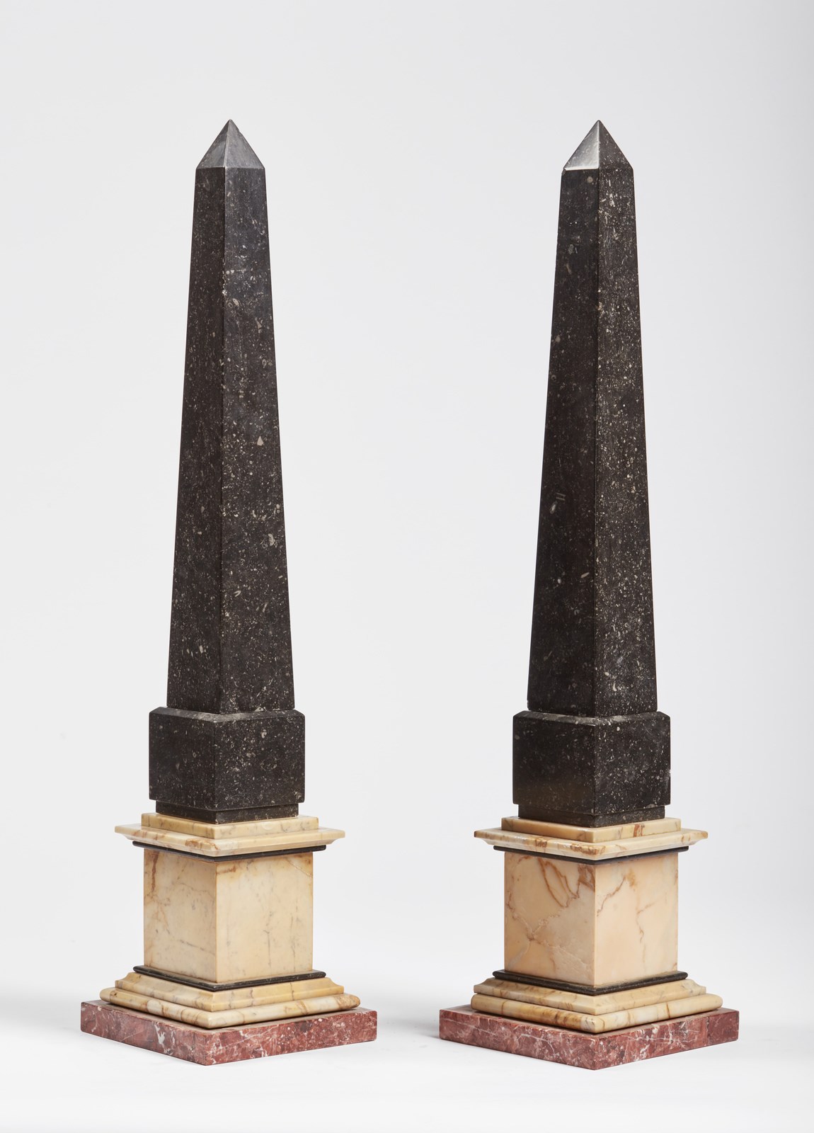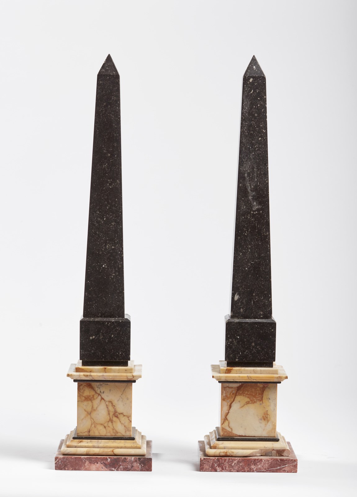 MANIFATTURA DEL XX SECOLO - Coppia di obelischi in marmo nero e base in marmo gialla.