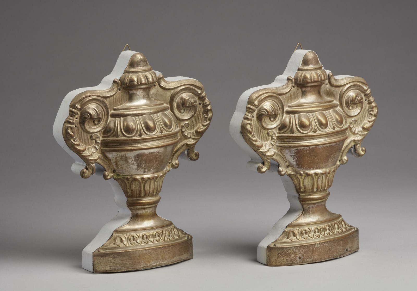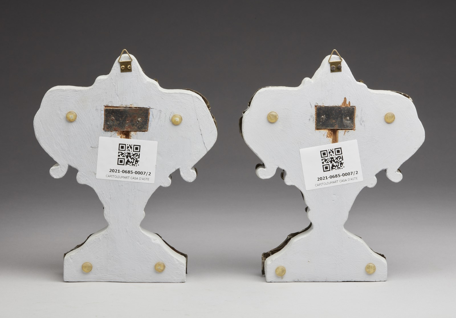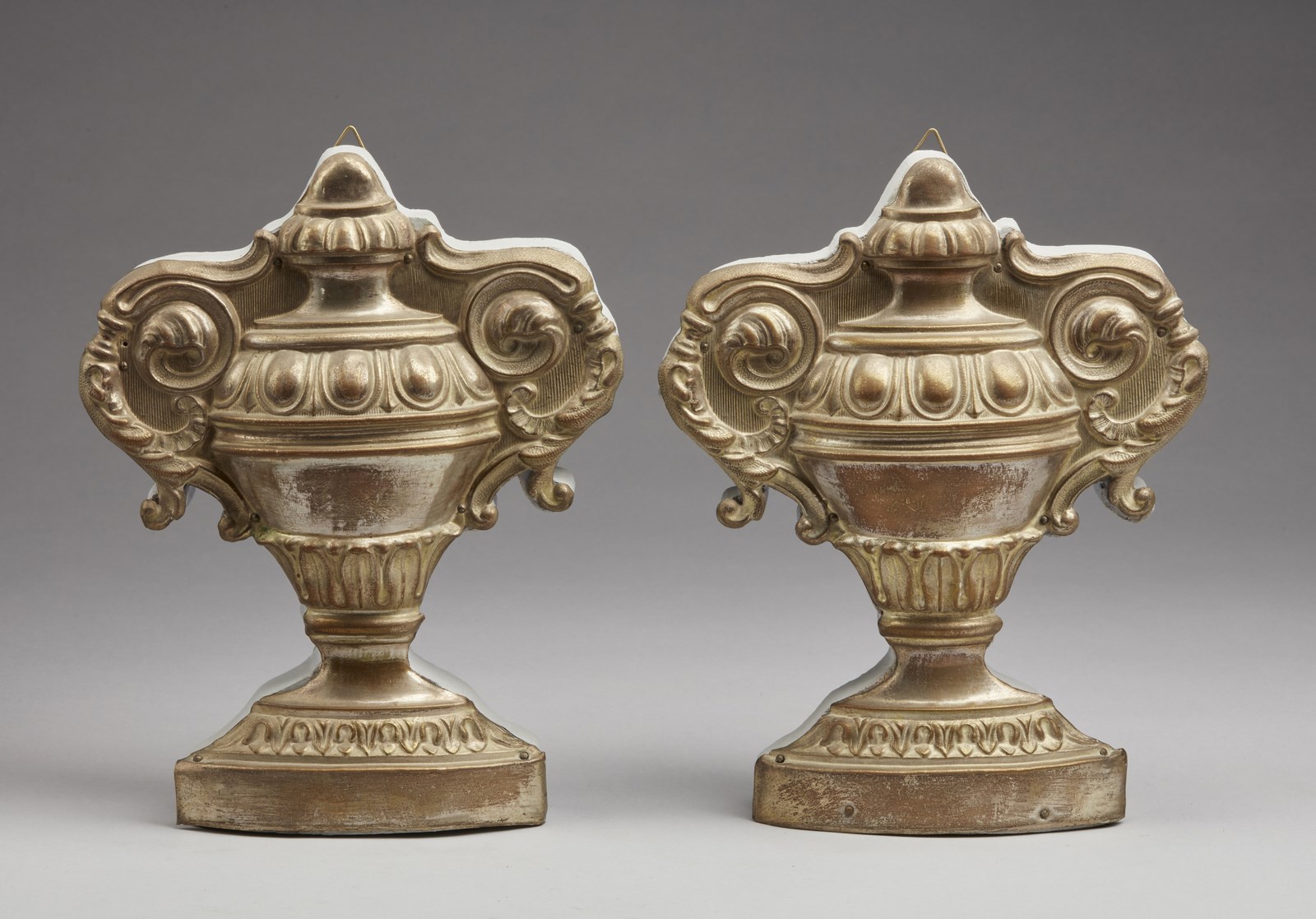 MANIFATTURA DEL XVIII SECOLO - Coppia di portapalme in ottone argentato su legno, in forma di urna antica.