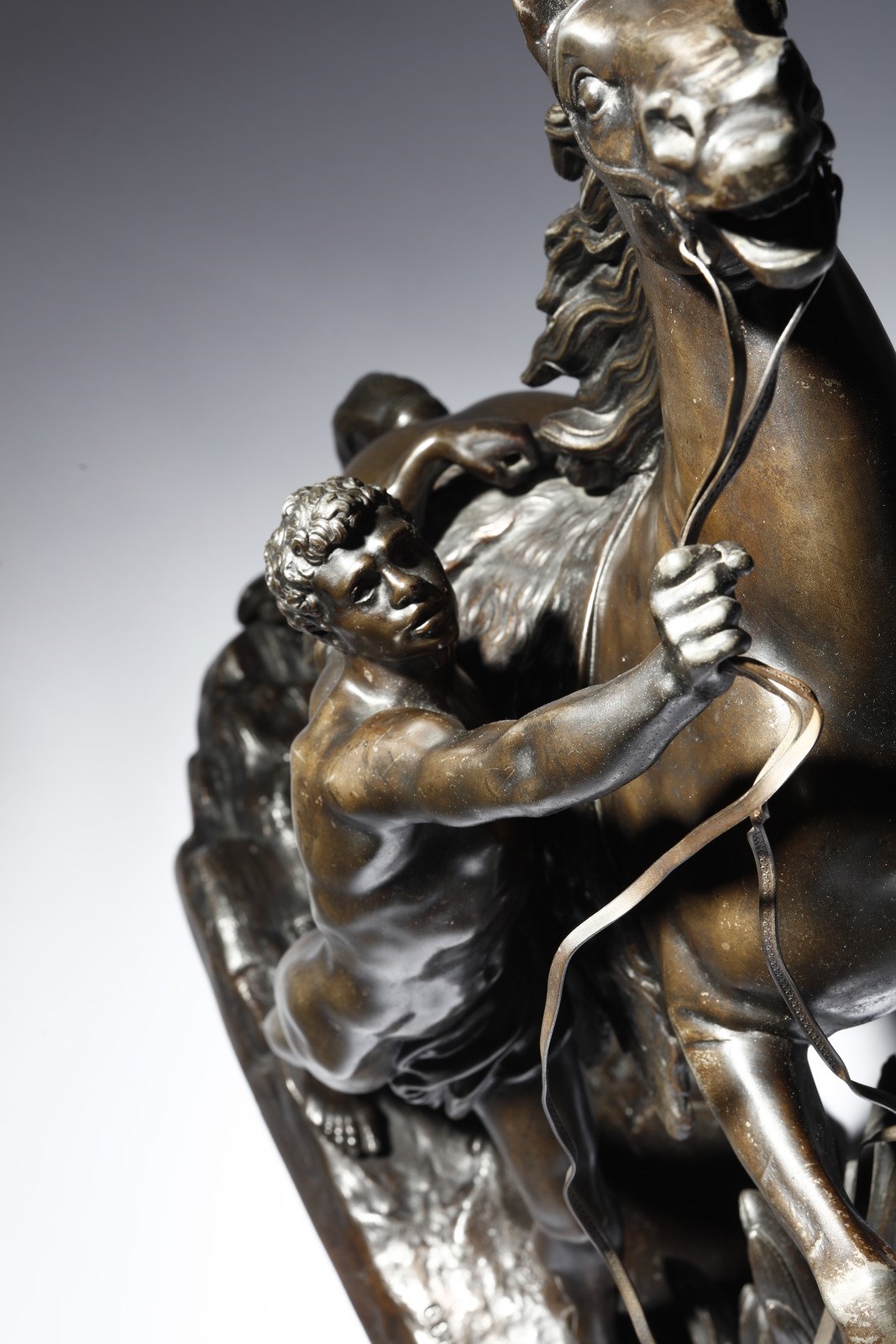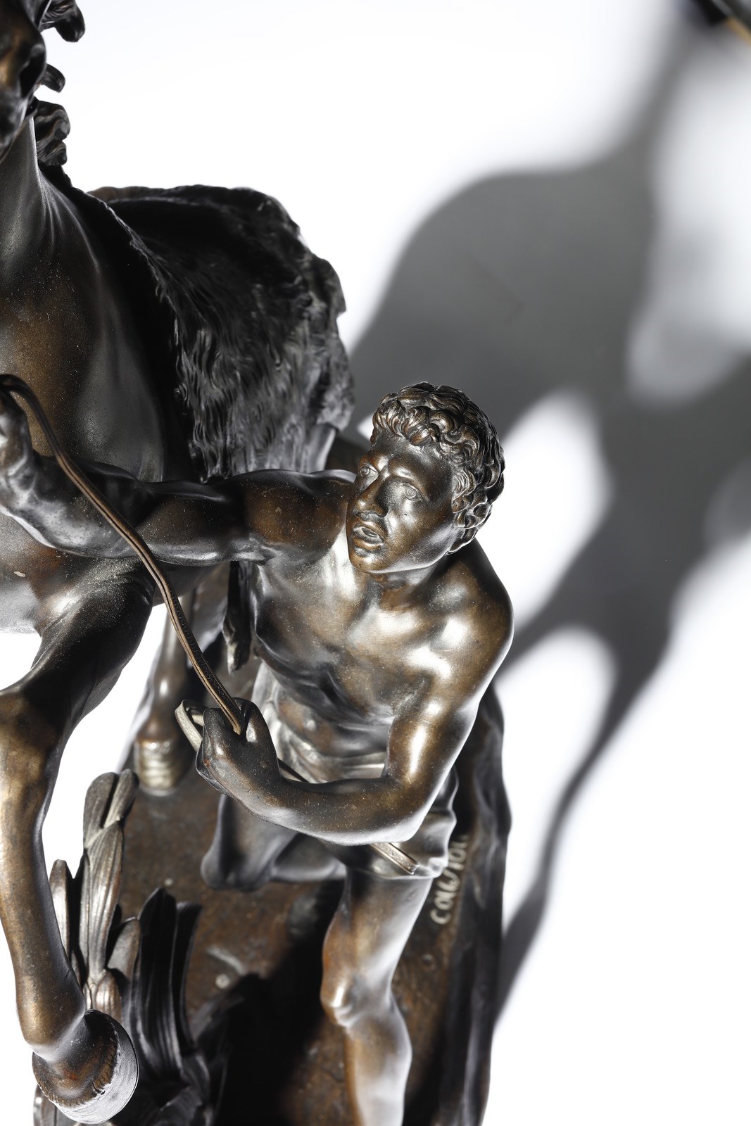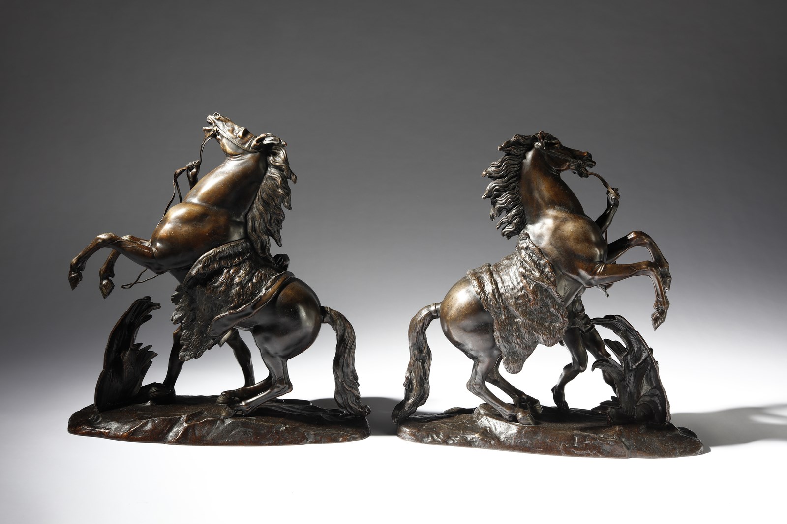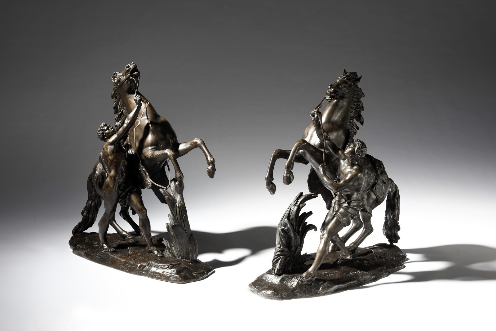 BRONZISTA DEL XIX SECOLO Coppia di sculture dei Cavalli di Marly dal modello di Guillaume Coustou. Bronzo. Cm 53,00 x 56,00 x 21,00. Firma "Coustou" sulla base.