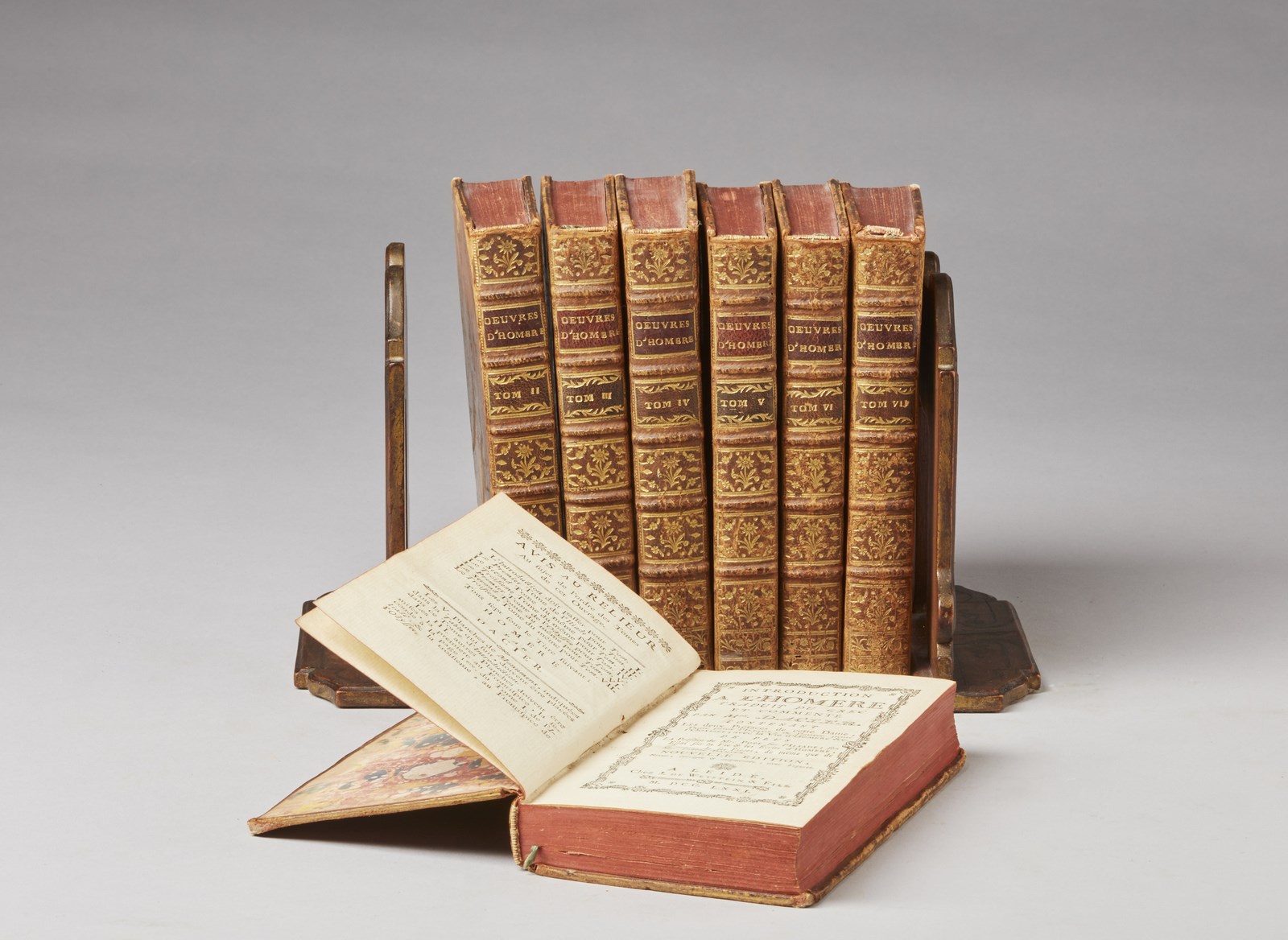 MANIFATTURA FRANCESE DEL XVIII SECOLO Oeuvres d'Homére in sette volumi rilegati in pelle e datati 1771. . Cm 10,00 x 17,00 x 2,00. Con fermalibri in legno.