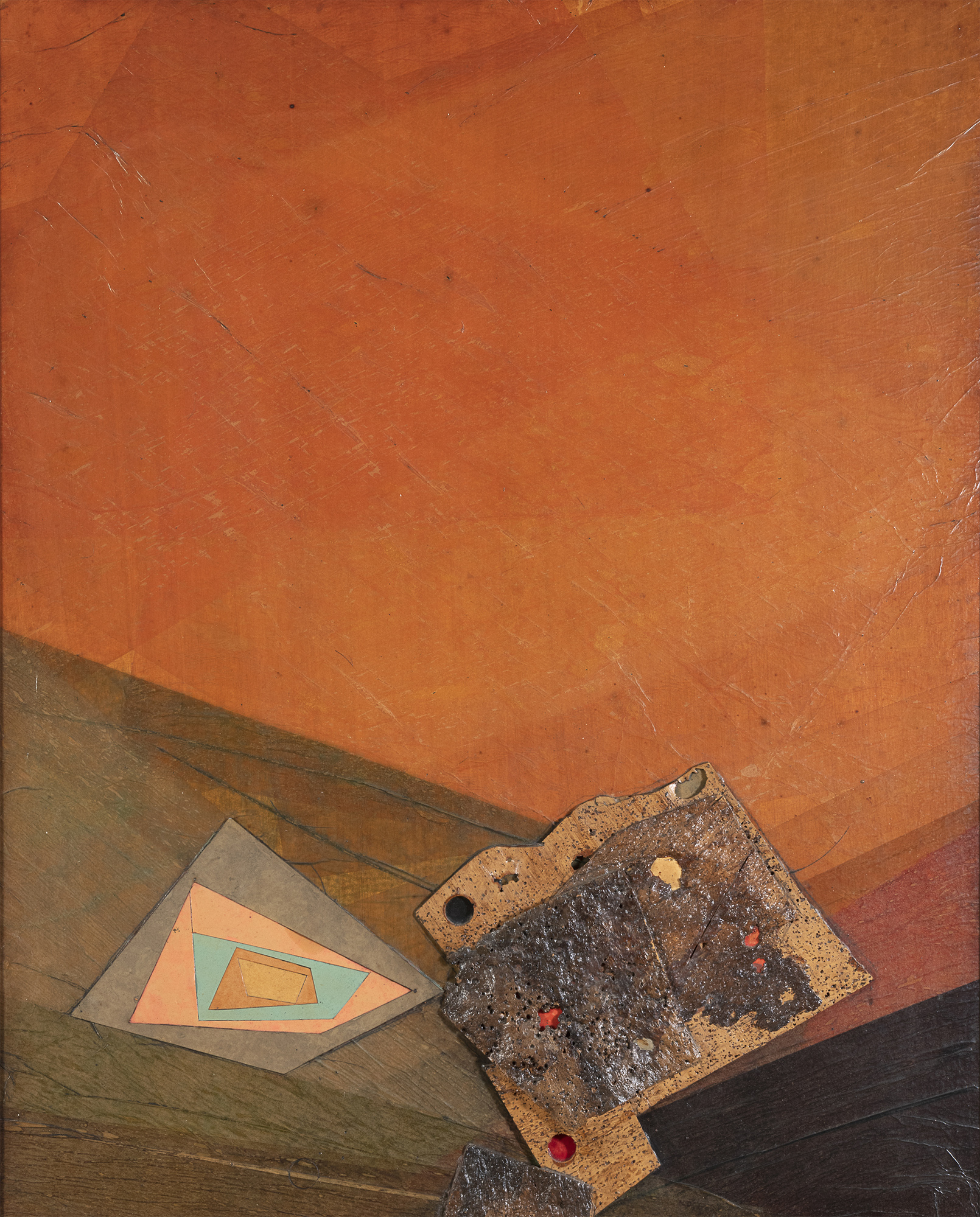 Tecnica mista, sughero e collage su tavola, cm. 101 x 81