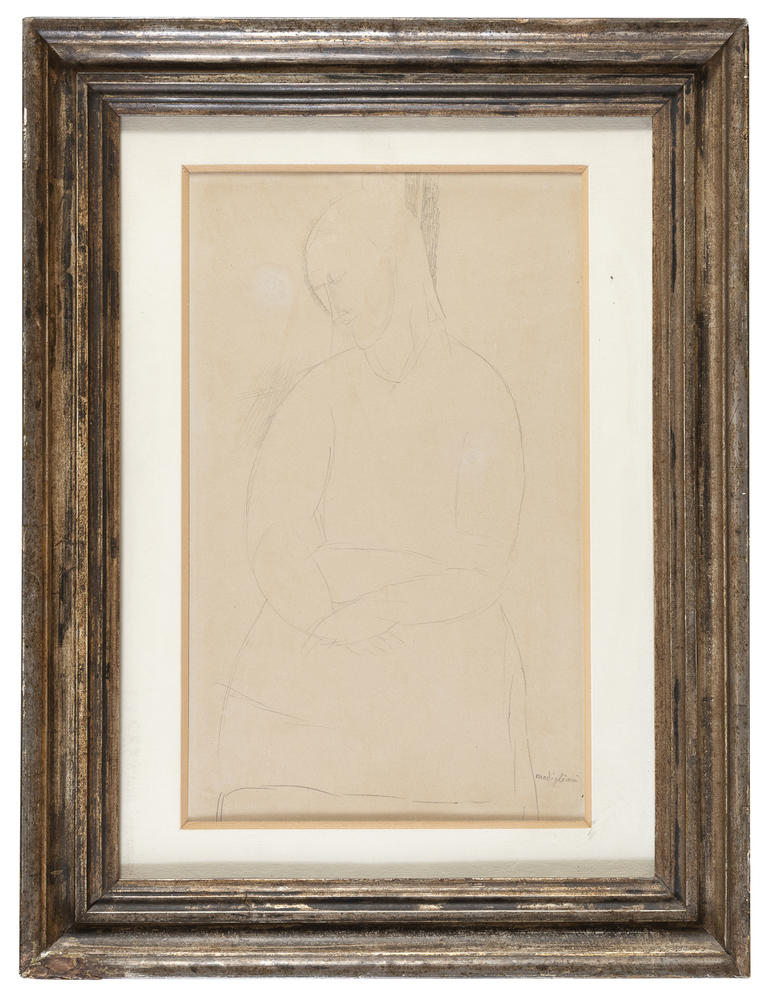 Il disegno, qui proposto in vendita, datato da Franco Russoli e da Osvaldo Patani al 1915, appartiene alla grande poetica della ritrattistica che Modigliani adotta a partire dal 1914: una ragazza seduta con il capo leggermente inclinato, in una posa resa nell’inconfondibile linguaggio stilistico derivato dall’arte toscana del Tre e Quattrocento, resa mediante linee sinuose ed eleganti interrotte sullo sfondo da un contrasto deciso di luce e ombra.