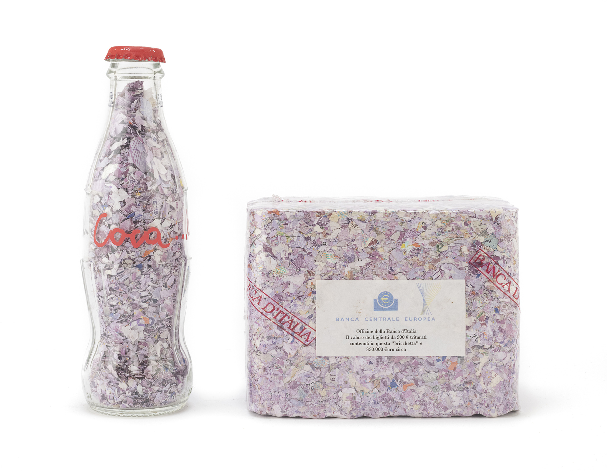 La bottiglietta di una bevanda "soft popolare" I colori classici di una banconota "da ricchi", rara, esclusiva, ma il cui taglio, da 500 euro, è "tagliato" come fossero coriandoli.
