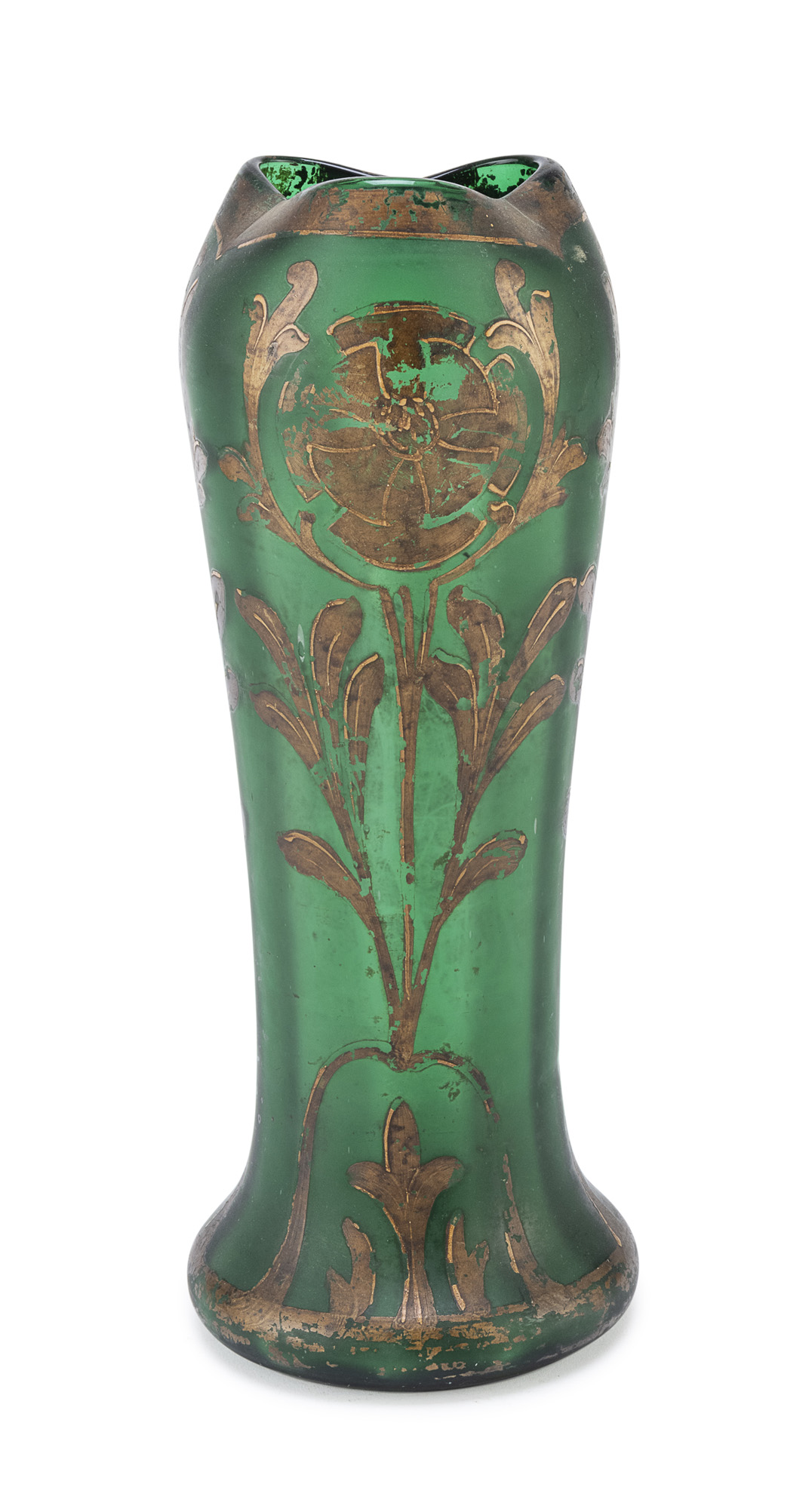 a fondo verde a sagoma di bulbo, con decori in oro a motivi vegetali.