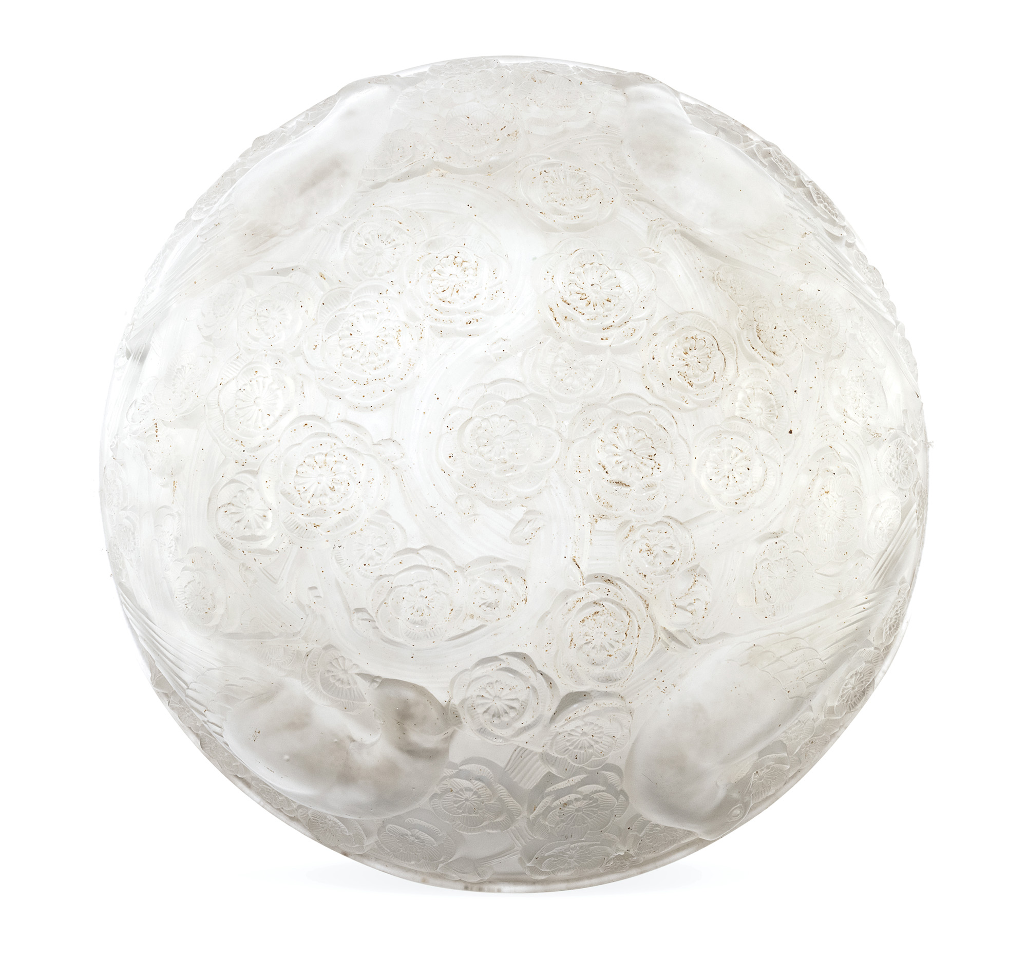con sagoma a calotta con decoro in rilievo di rose, uccelli e foche.