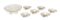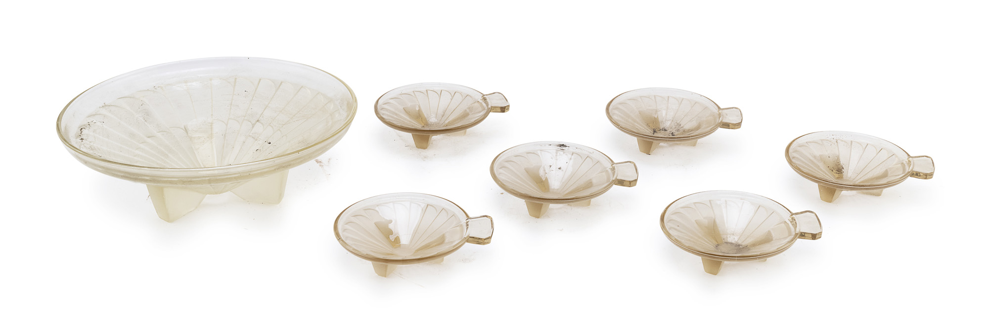 con corpo costolato a ventaglio, sorretto da tripode. Composto da sei coppette e un'alzata In cristallo sabbiato.