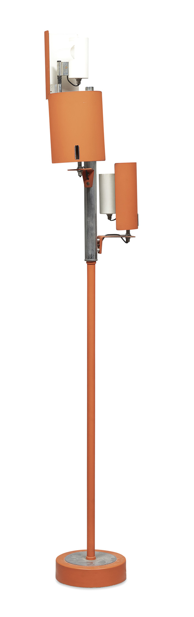 in metallo a smalto arancio e alluminio cromato. Due punti luce con paralumi a ventolina in metallo smaltato arancio. Base circolare.