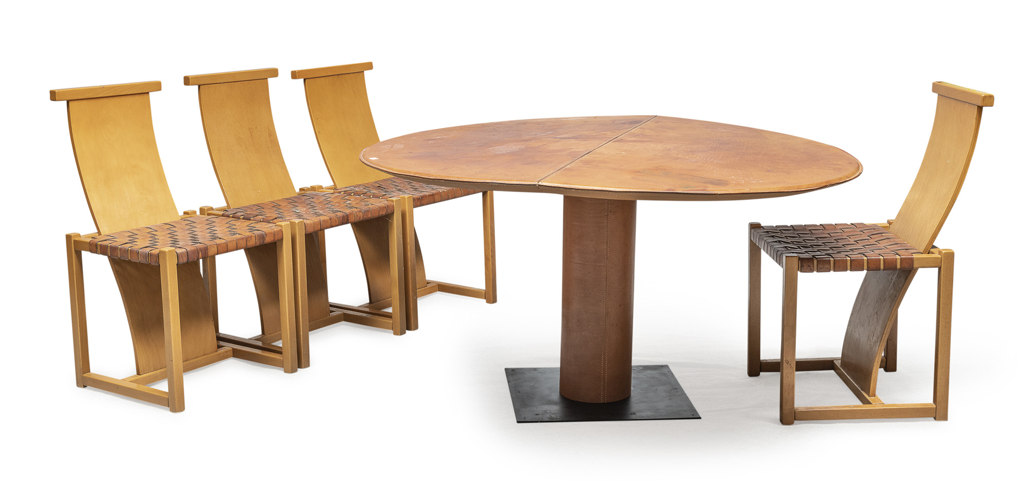 tavolo in legno interamente rivestito in cuoio con gamba centrale a cilindro e base quadrata in metallo. Sedie in frassino tinto con sedile in cuoio intrecciato con spalliera in legno curvato.