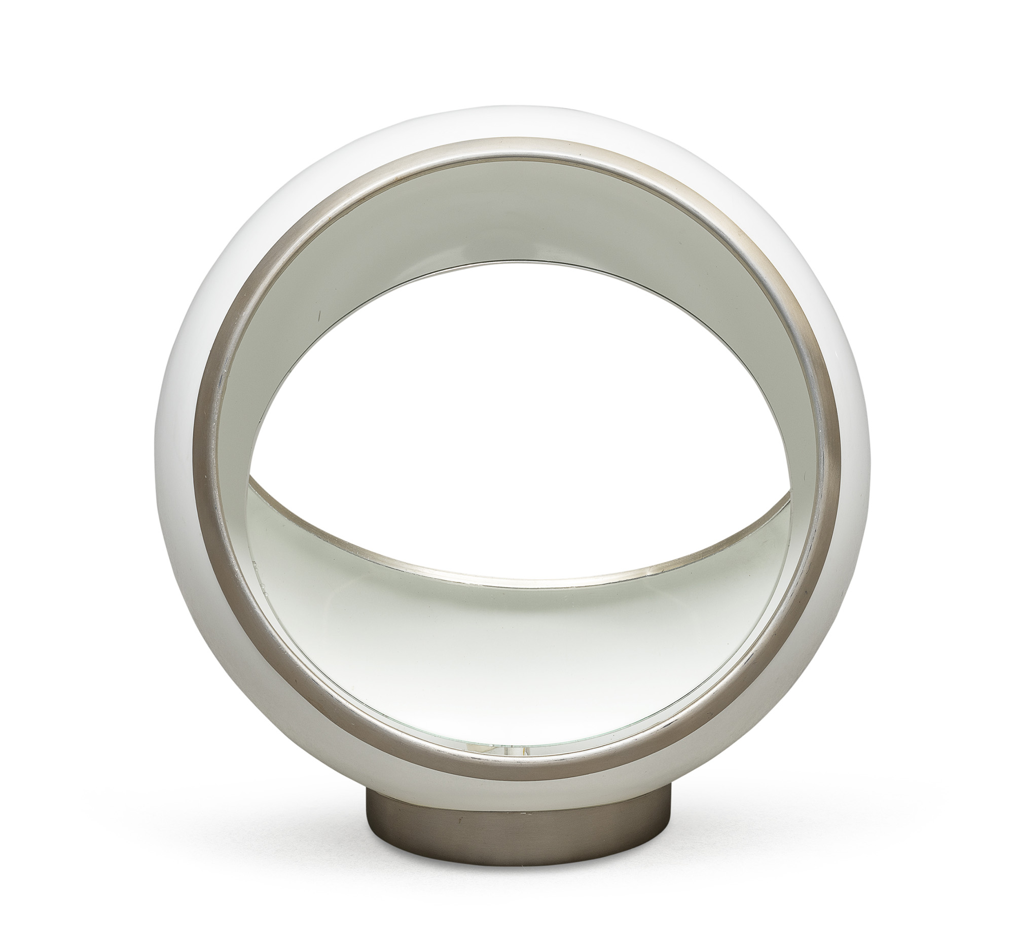 in metallo laccato con finiture cromate, a sagoma sferica tagliata sul fronte con specchio circolare snodabile.