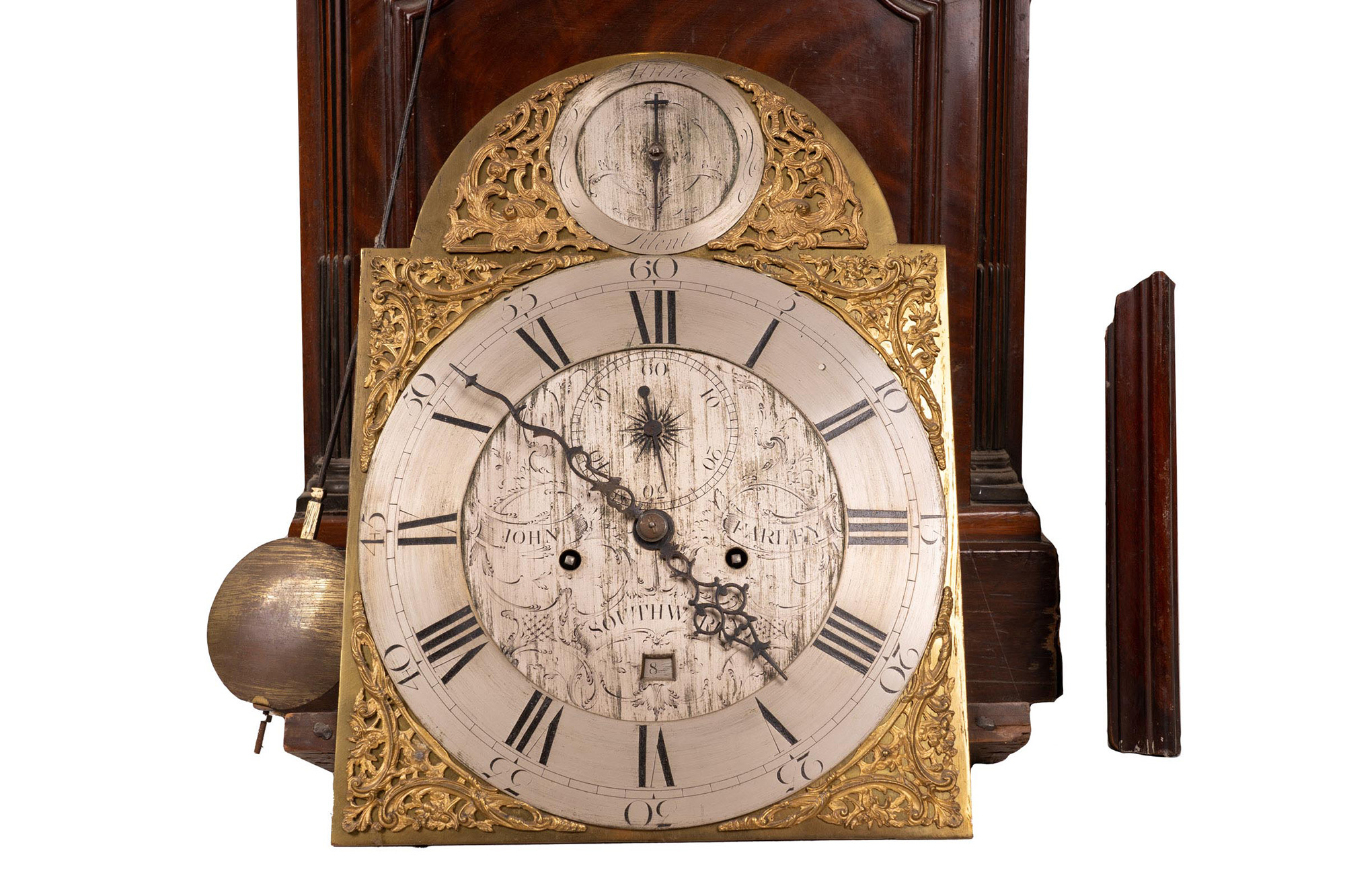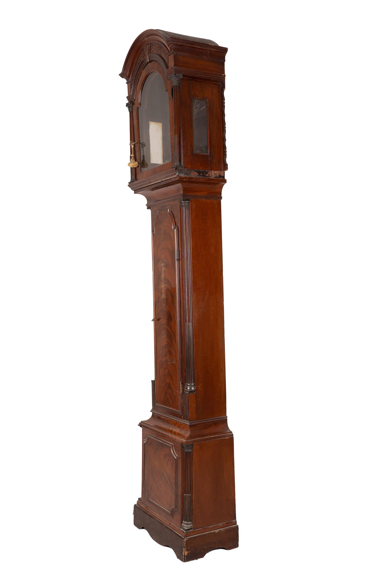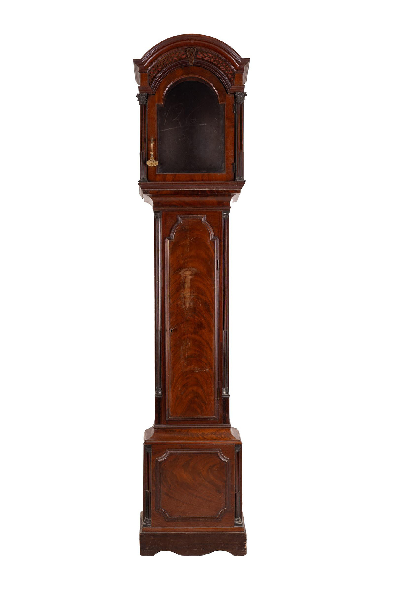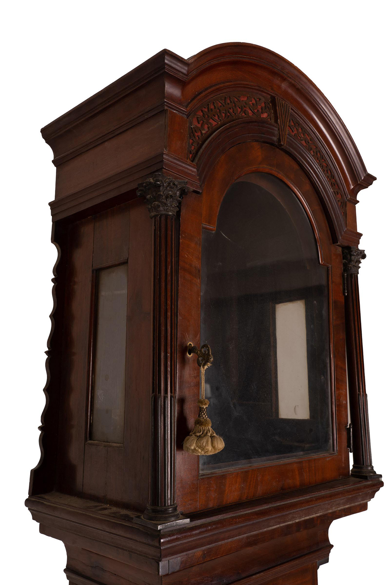 in piuma di mogano, parte superiore inquadrato fra colonne scanalate, quadrante in acciaio con numeri romani, marcato John Farley Soutwark