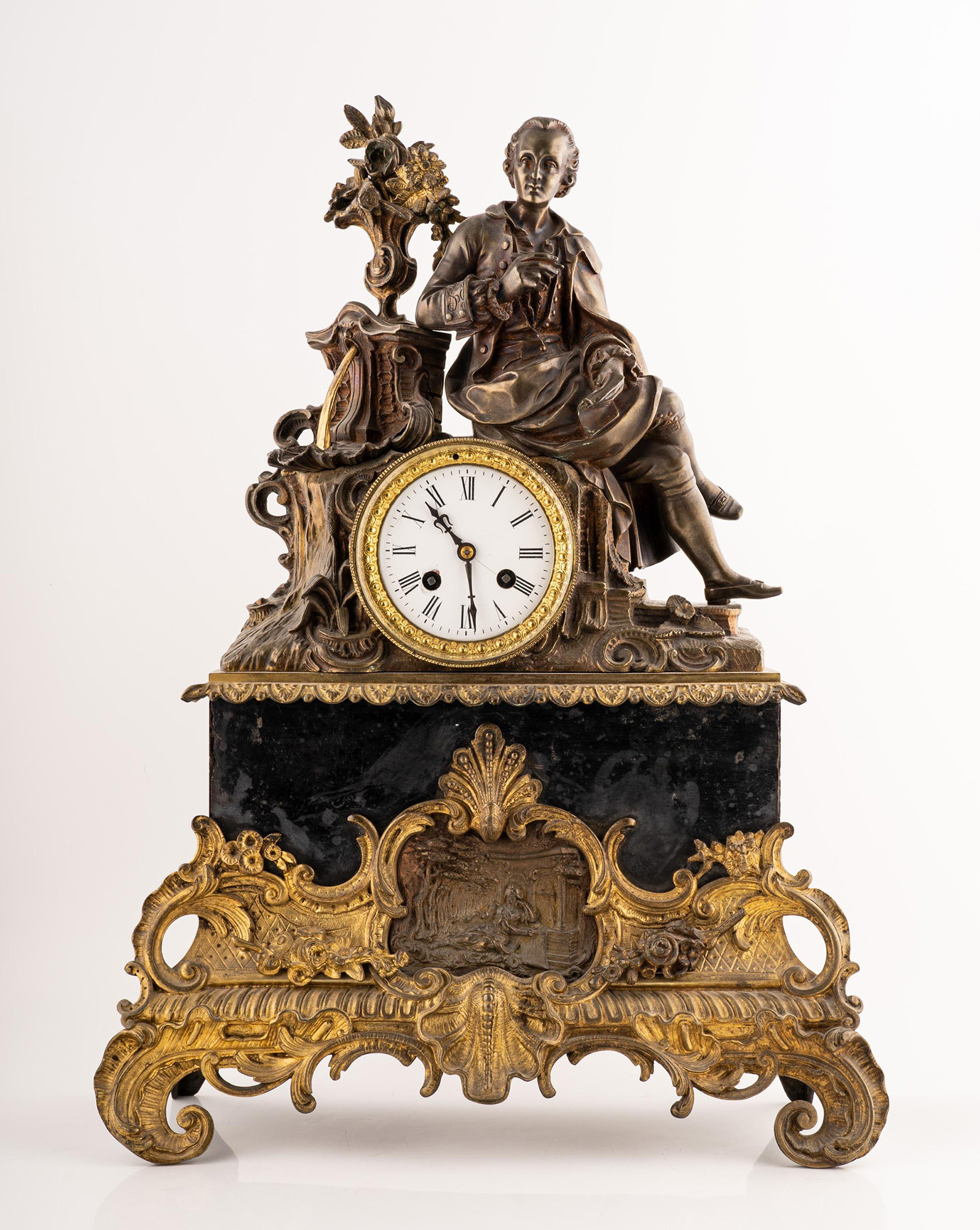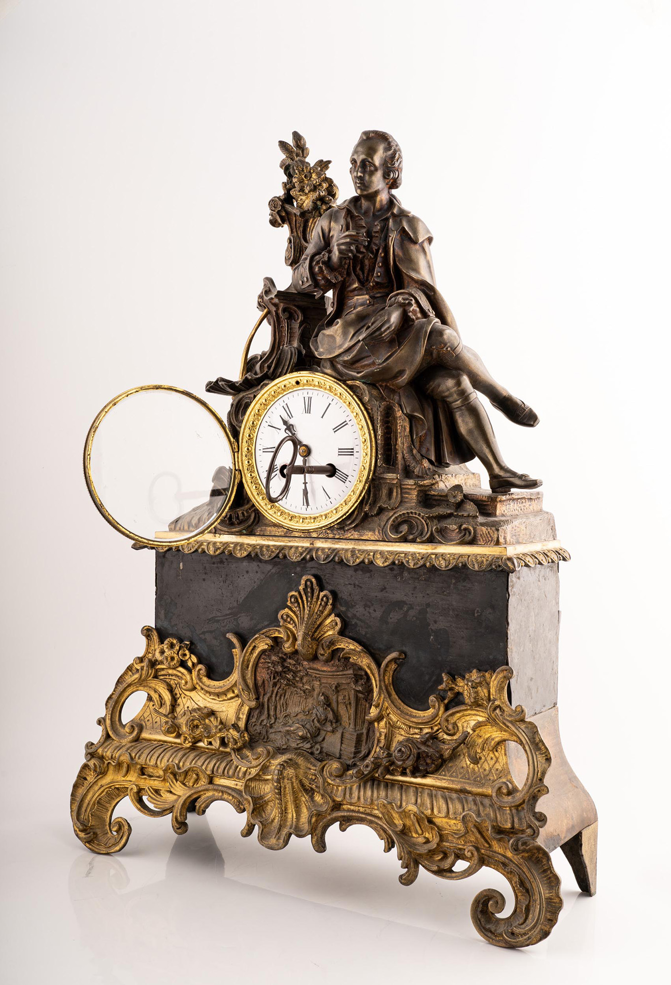 Orologio da tavolo in bronzo dorato con figura allegorica