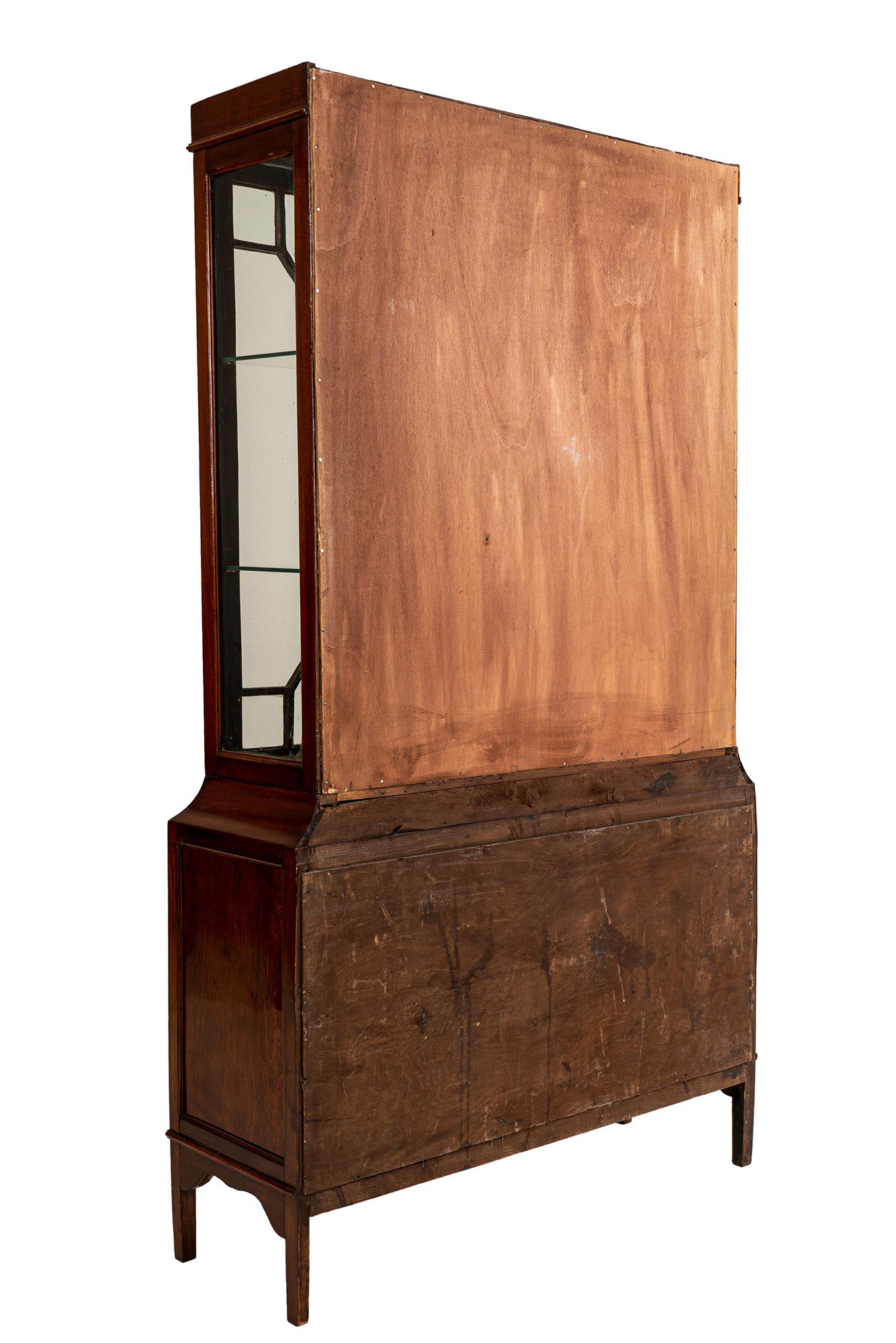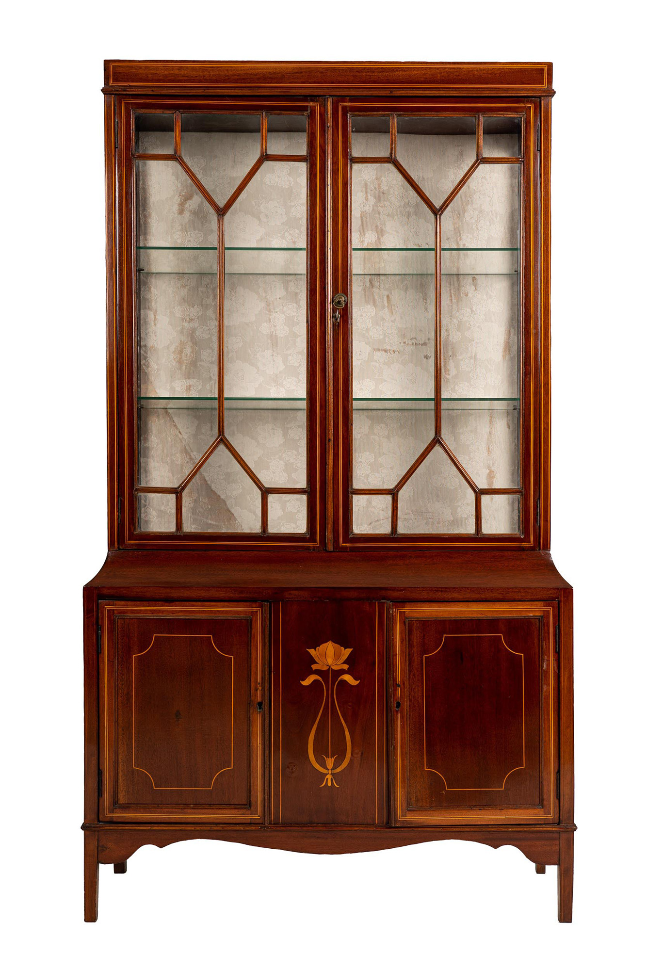 in mogano intarsiato a motivi floreali, due sportelli a vetri superiori e due sportelli nel corpo inferiore