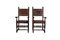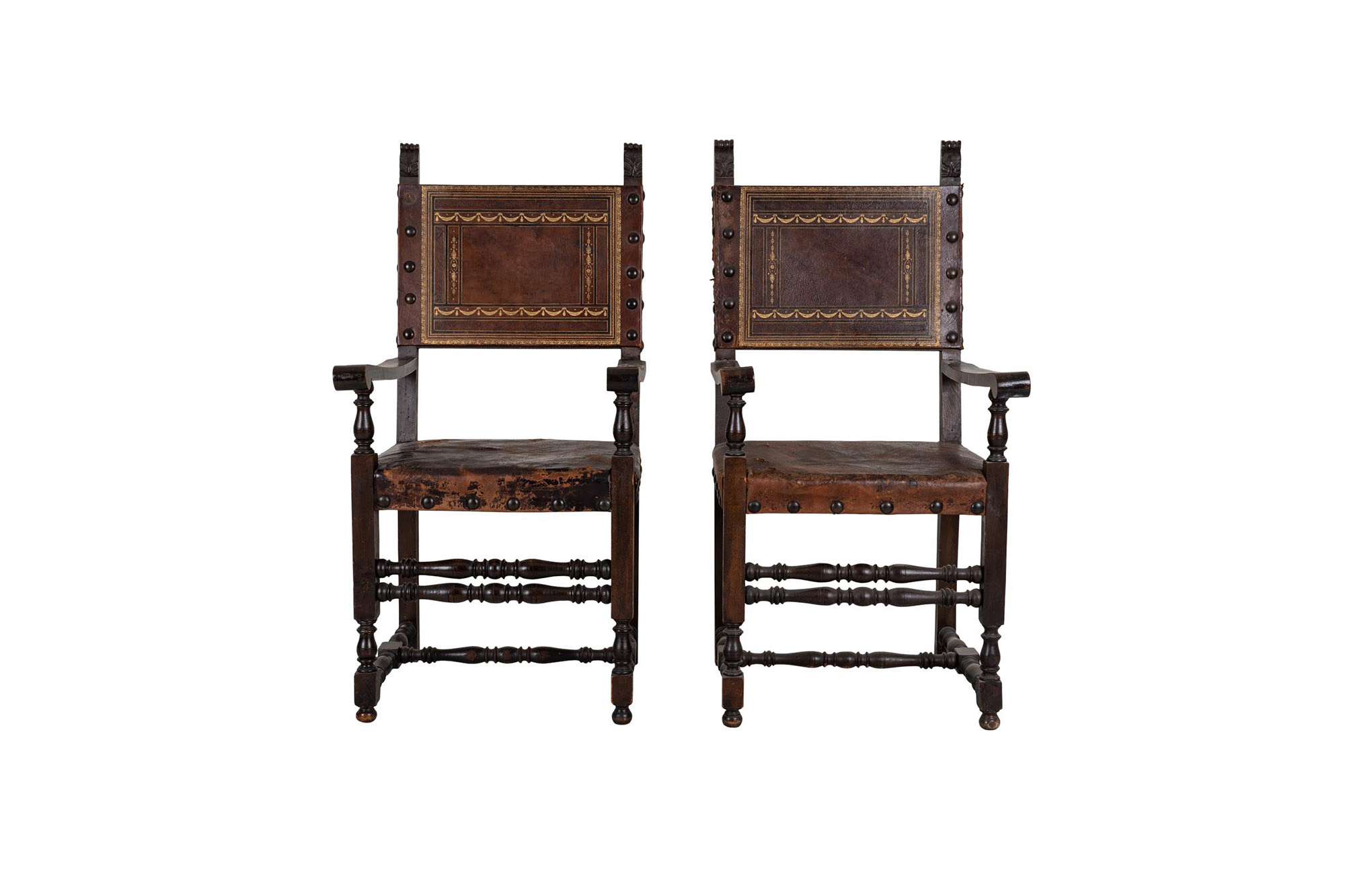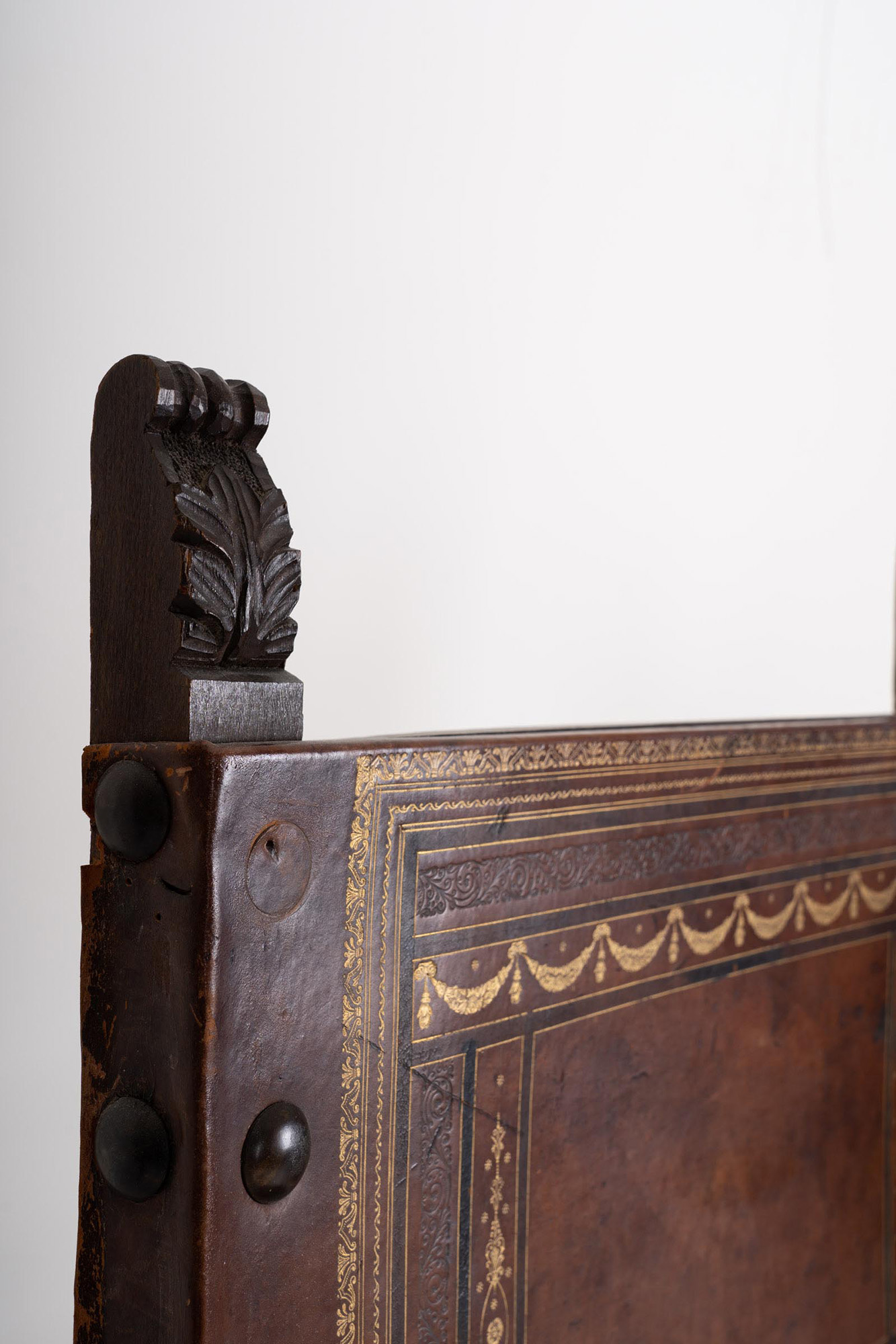 ,In noce con sedute e schienale in cuoio inciso e borchiato, sostegni a rocchetto
