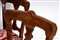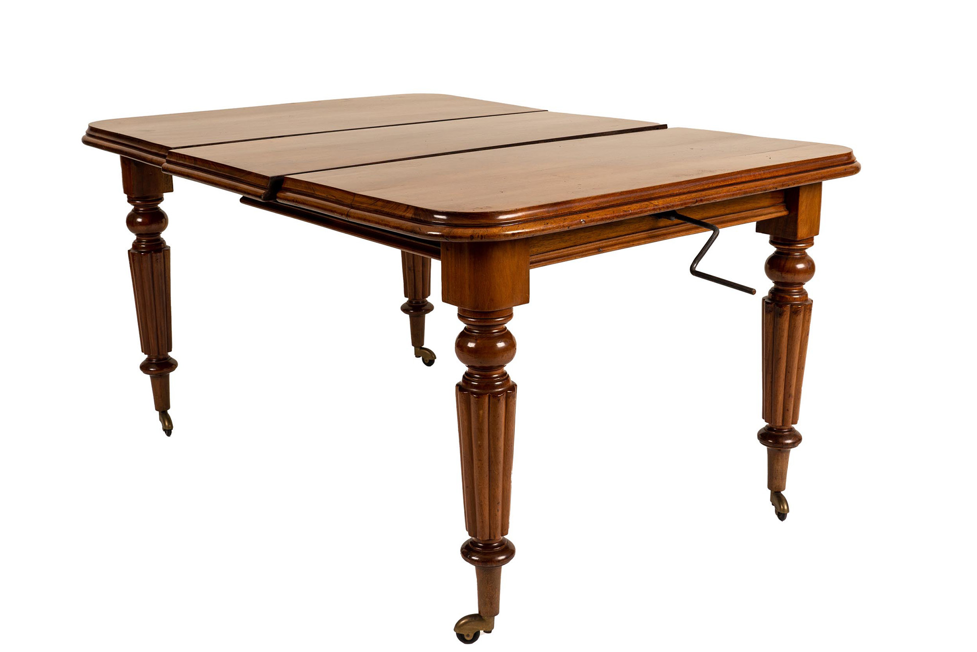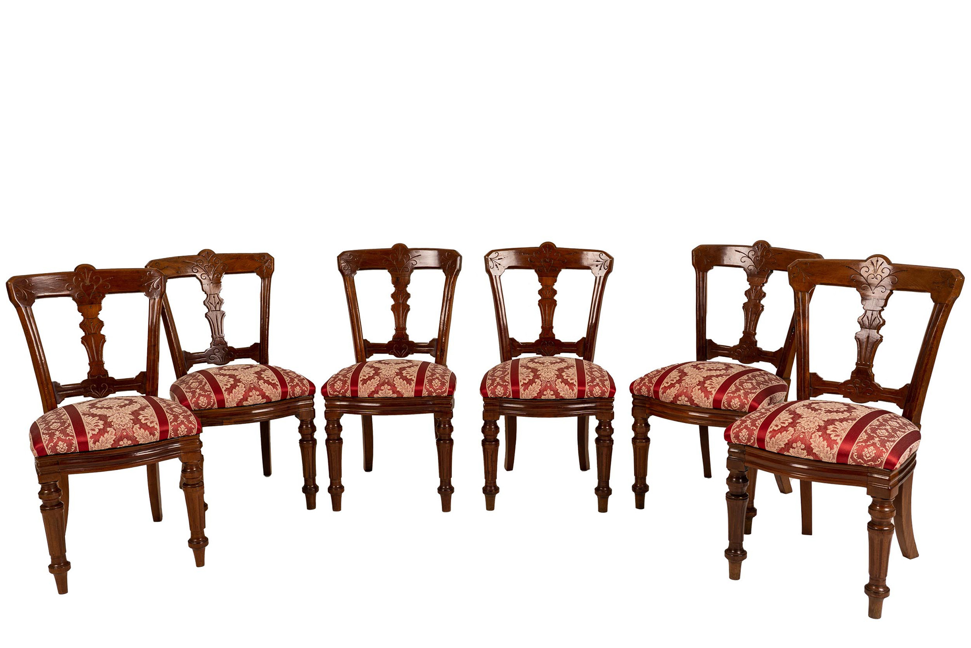 tavolo a piano rettangolare, gambe tornite e scannellate, completo di una prolunga; sedie in noce, spalliera sagomata, sedile ricoperto in cotone rosso, gambe tornite