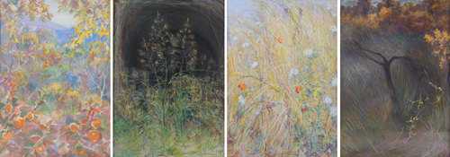 Elica Balla (Roma 1914 – 1993). Estate, Roma ’72; Triste canzone d’autunno, Roma ’84; Canto d’autunno, ’71; Paradisi perduti, ’74-‘75. Serie di 4 opere a tecnica mista (pastelli, tempera, collage) su carta, firme in basso, con cornici. Sul retro titoli, date e firma dell’artista. cm95x67 (difetti)