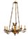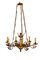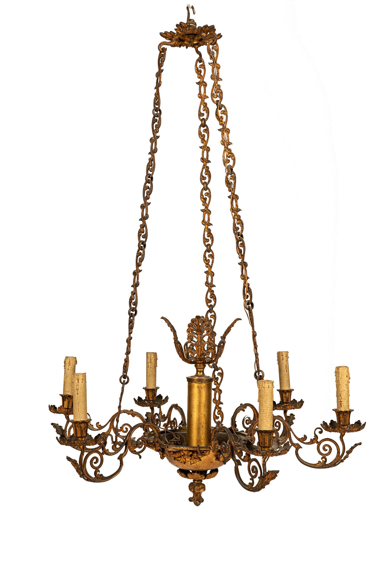 Lampadario in metallo brunito a sei braccia modellate a volute vegetali, coppia di appliques in metallo dorato a tre braccia modellate a volute vegetali