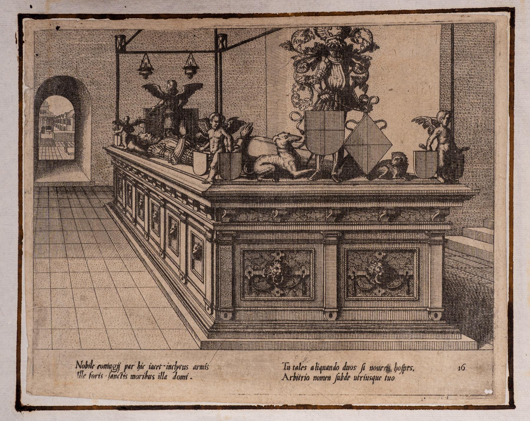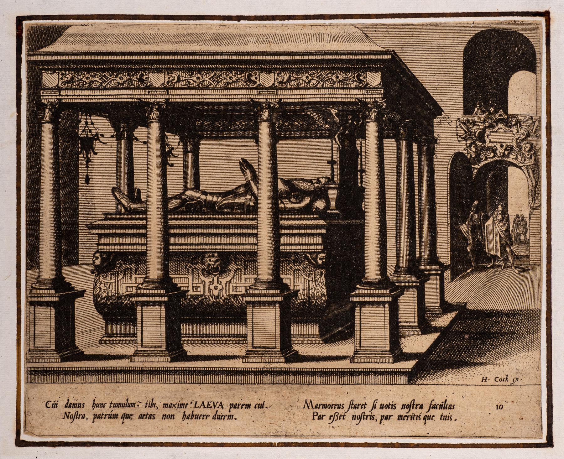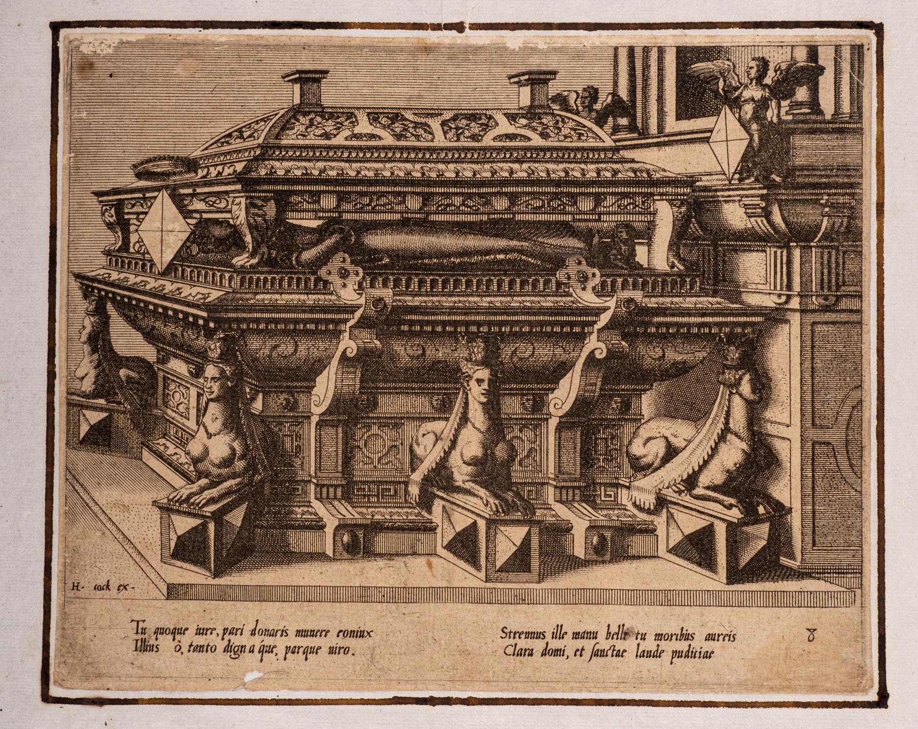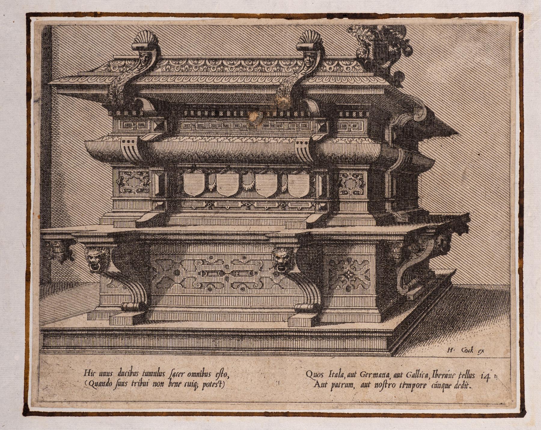 Hieronymus Cock (1518 - 1570), Serie di 18 incisioni raffiguranti tombe monumentali, XVI secolo, incisione a bulino su carta vergellata applicata a cartoncino di epoca più tarda, cm 17x21.