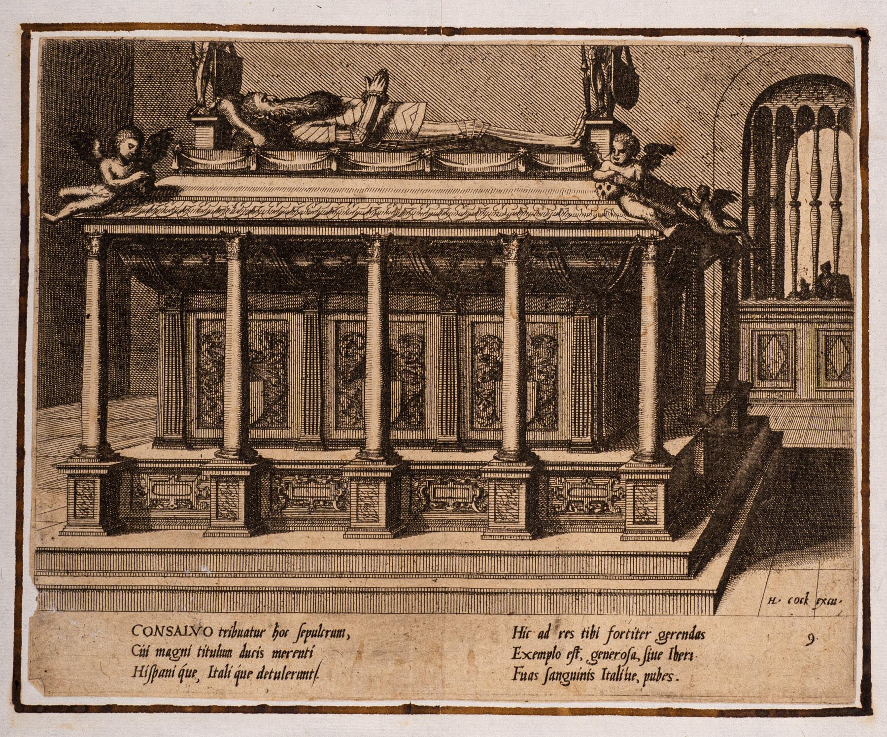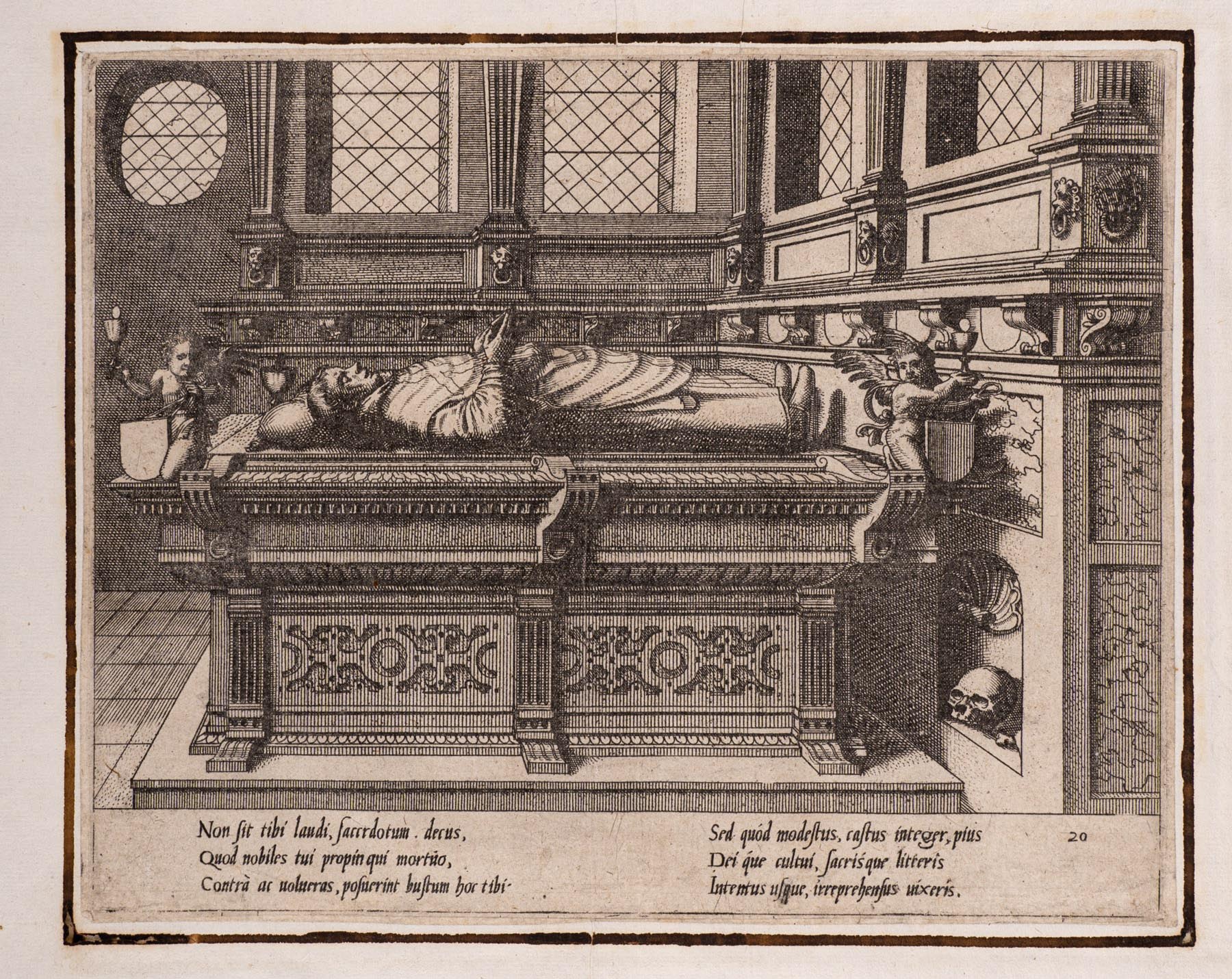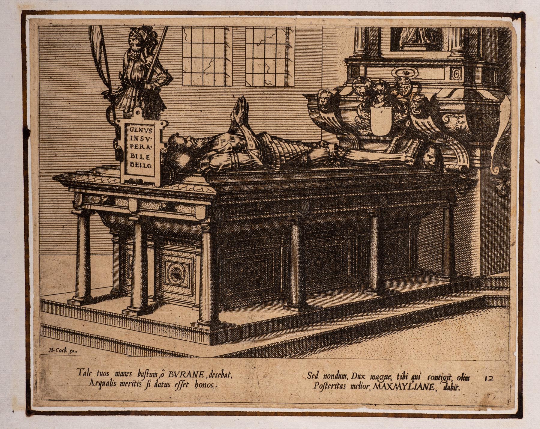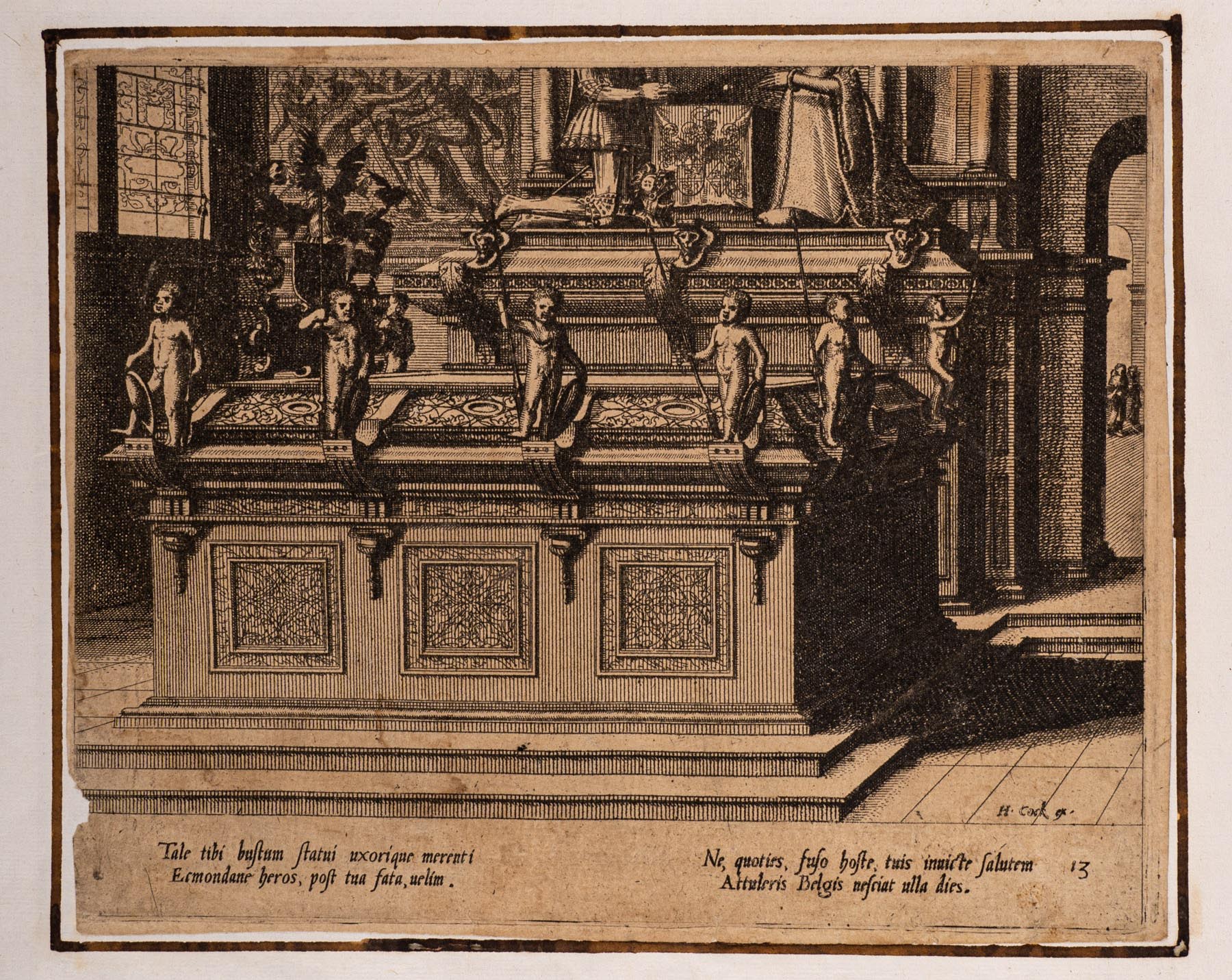 Hieronymus Cock (1518 - 1570), Serie di 18 incisioni raffiguranti tombe monumentali, XVI secolo, incisione a bulino su carta vergellata applicata a cartoncino di epoca più tarda, cm 17x21.