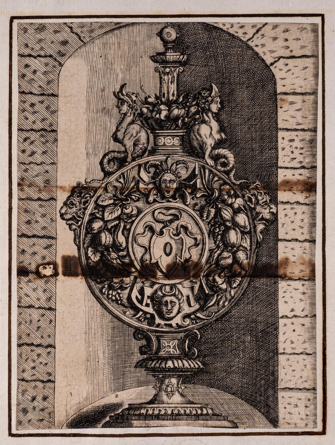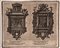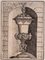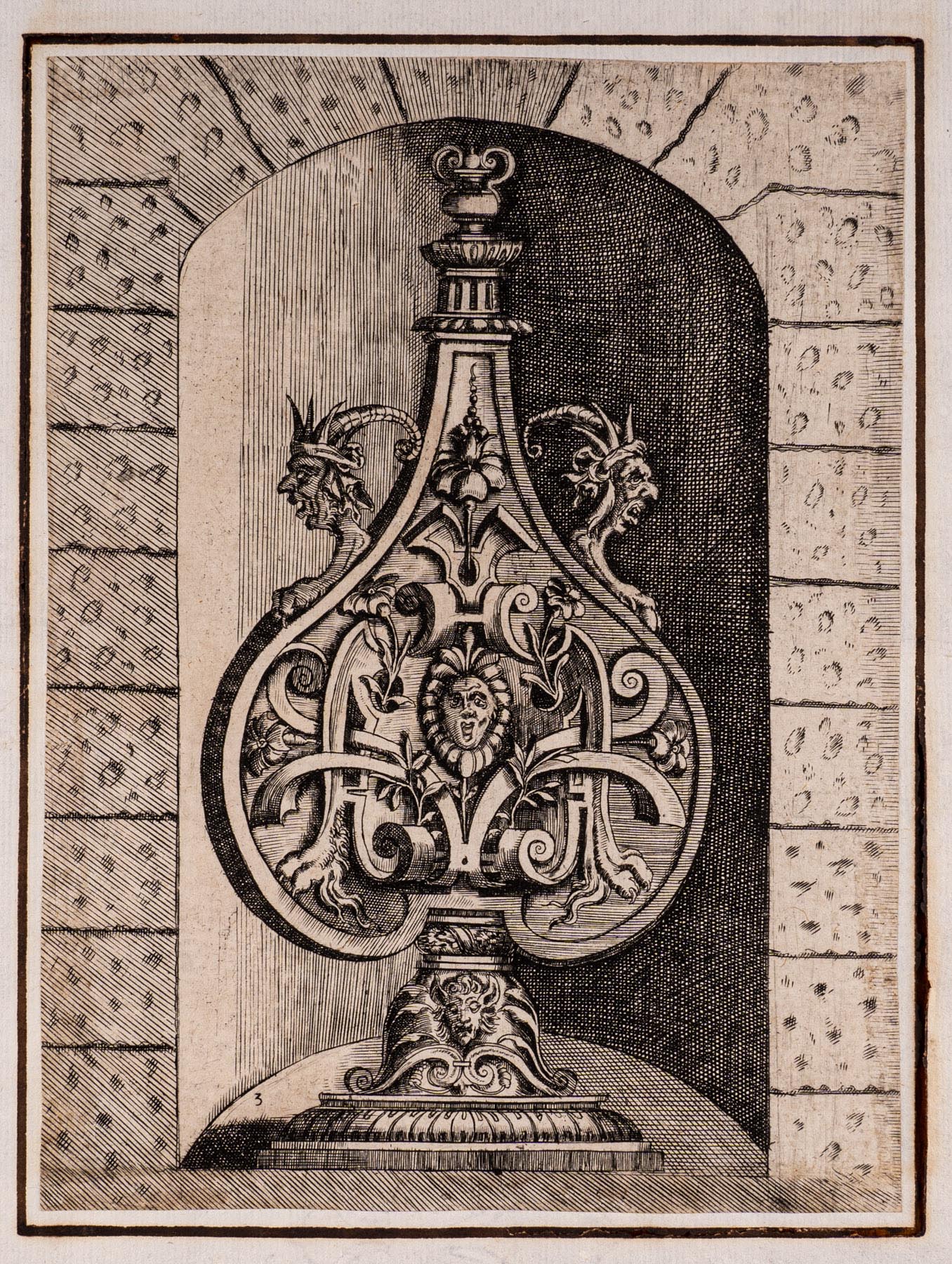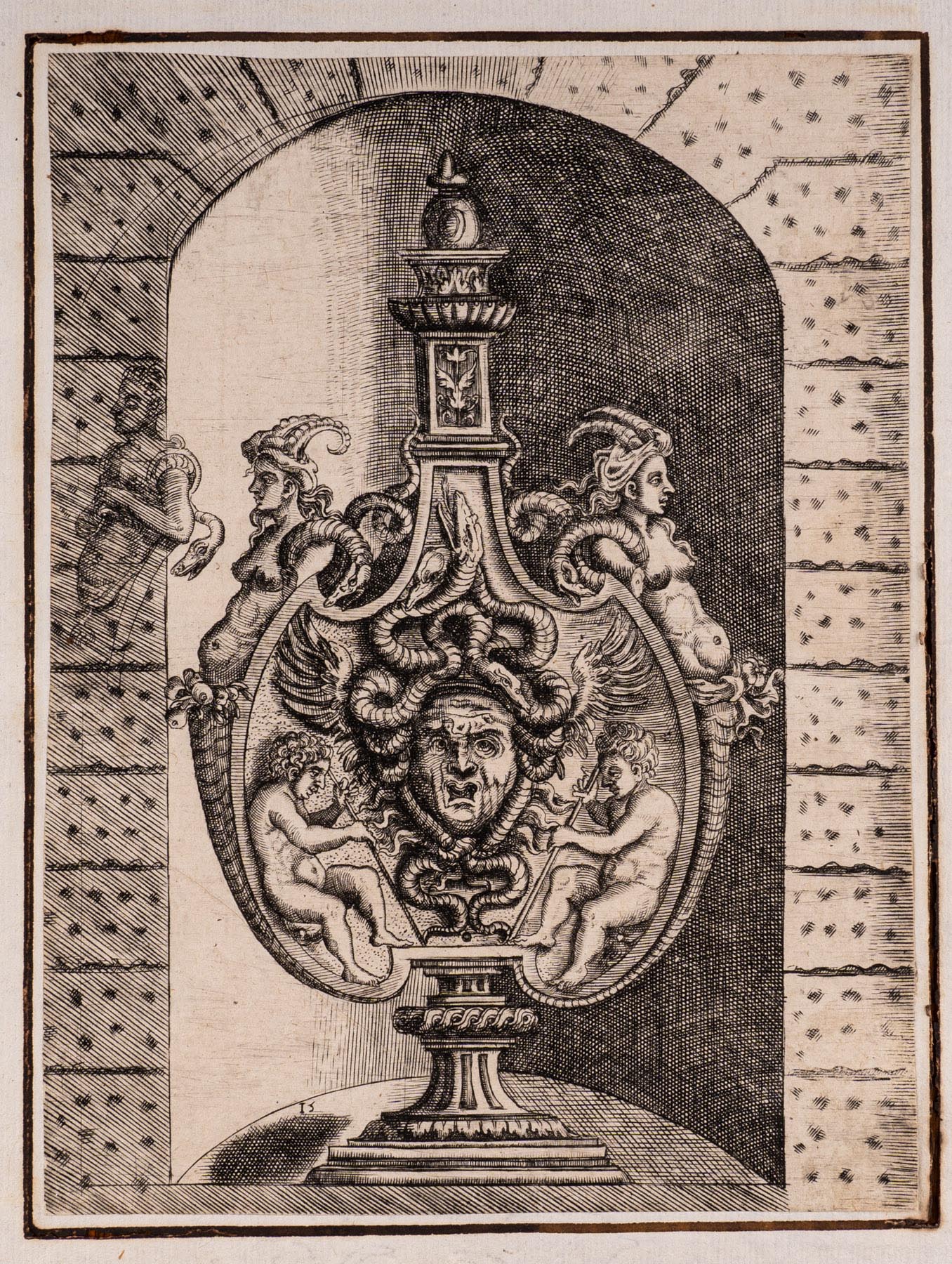 Serie di 17 incisioni con reliquiari decorati a grottesca, XVI secolo, incisione a bulino su carta vergellata applicata a cartoncino di epoca più tarda, cm 19x14.