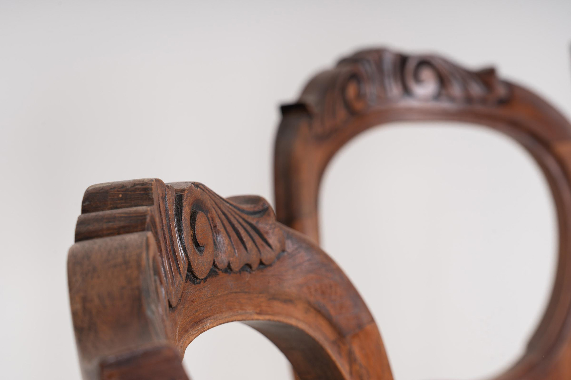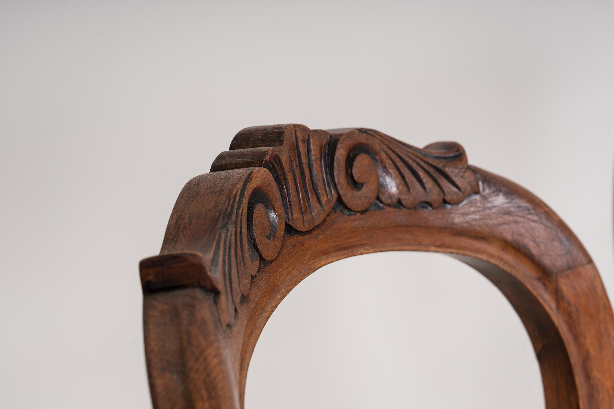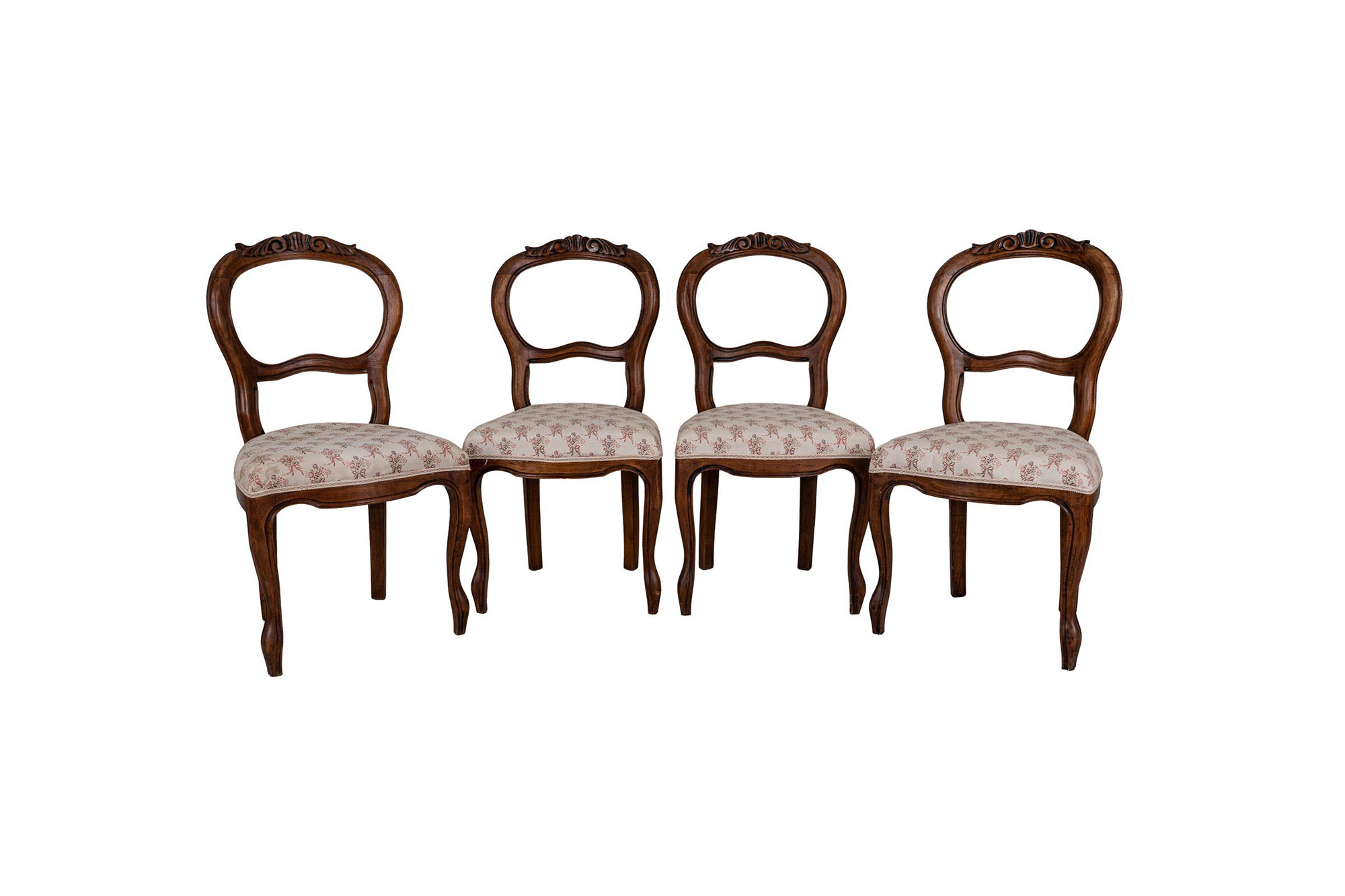 in noce, spalliera sagomata con cartella intagliata a volute, gambe mosse, seduta con tappezzeria a mazzetti di fiori (4)