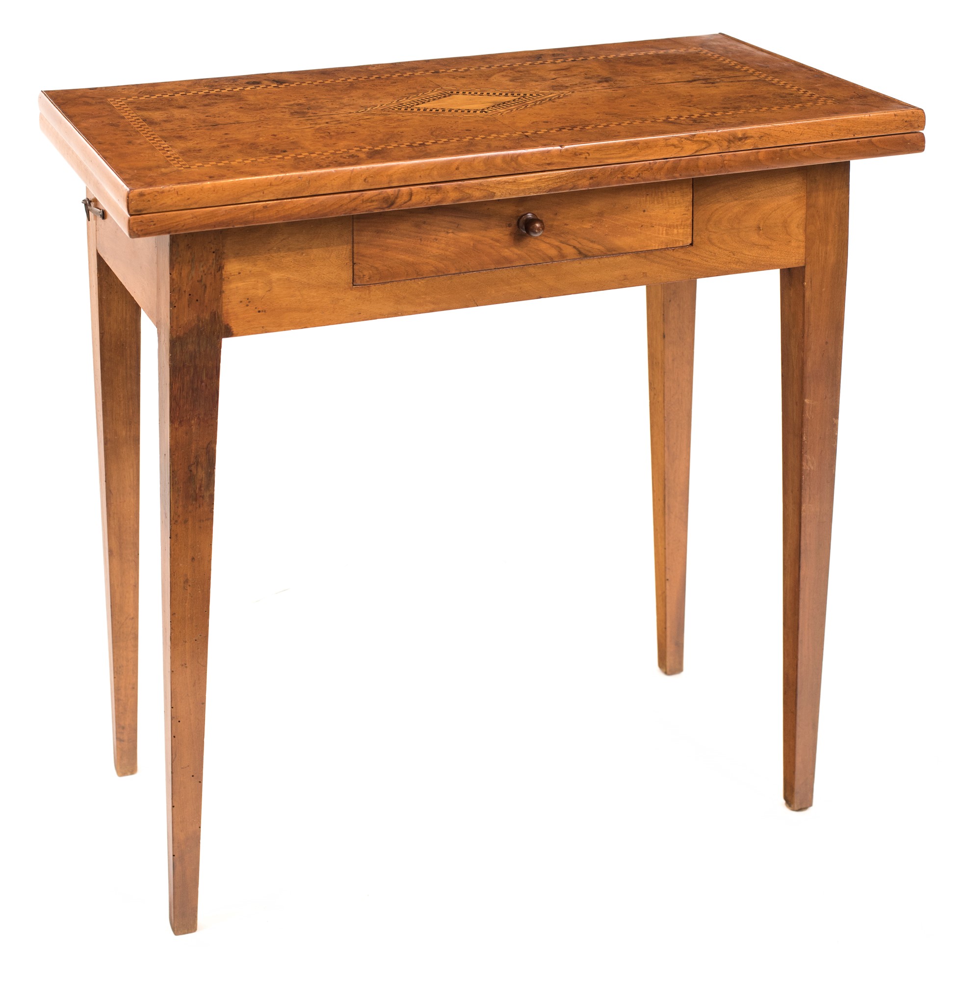 Tavolino da gioco in ciliegio e legni di varie essenze, fine del XVIII secolo con piano rettangolare a libretto centrato da una losanga racchiusa da bordura minuziosamente intarsiata in legni di frutto a motivi geometrici; un tiretto al centro della fascia, gambe rastremate cm 80x80x40