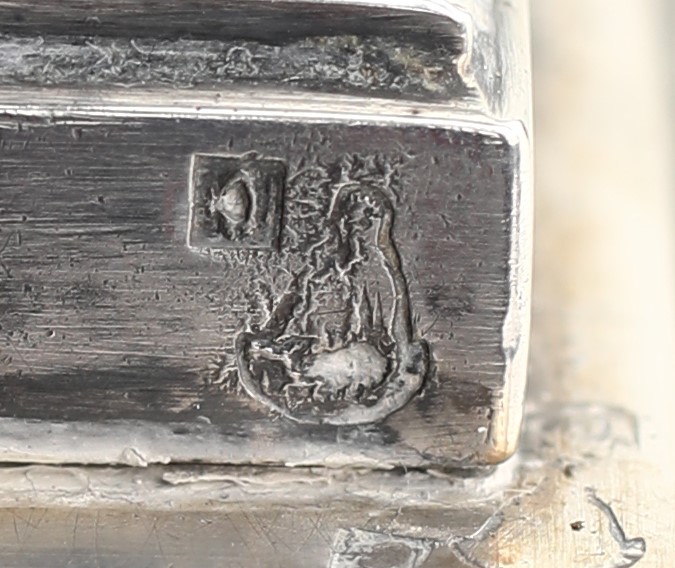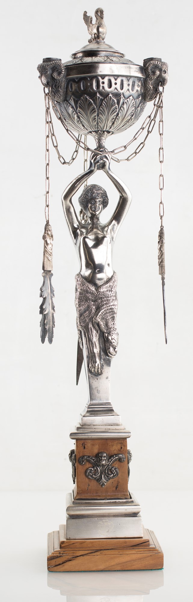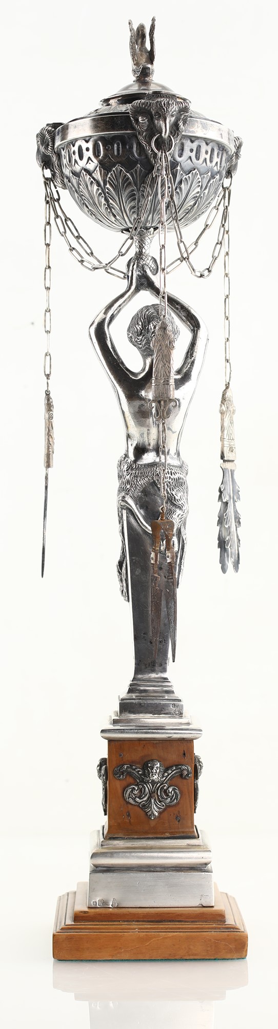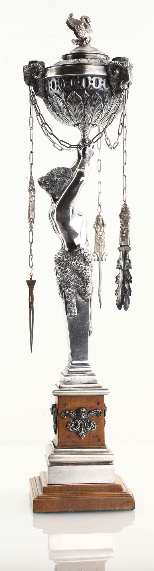Lucerna in argento, XIX secolo composta da una vaschetta baccellata a tre beccucci con teste d'ariete, sorretta da un' erma muliebre parzialmente avvolta in una pelle di leone; base squadrata altezza cm 60
