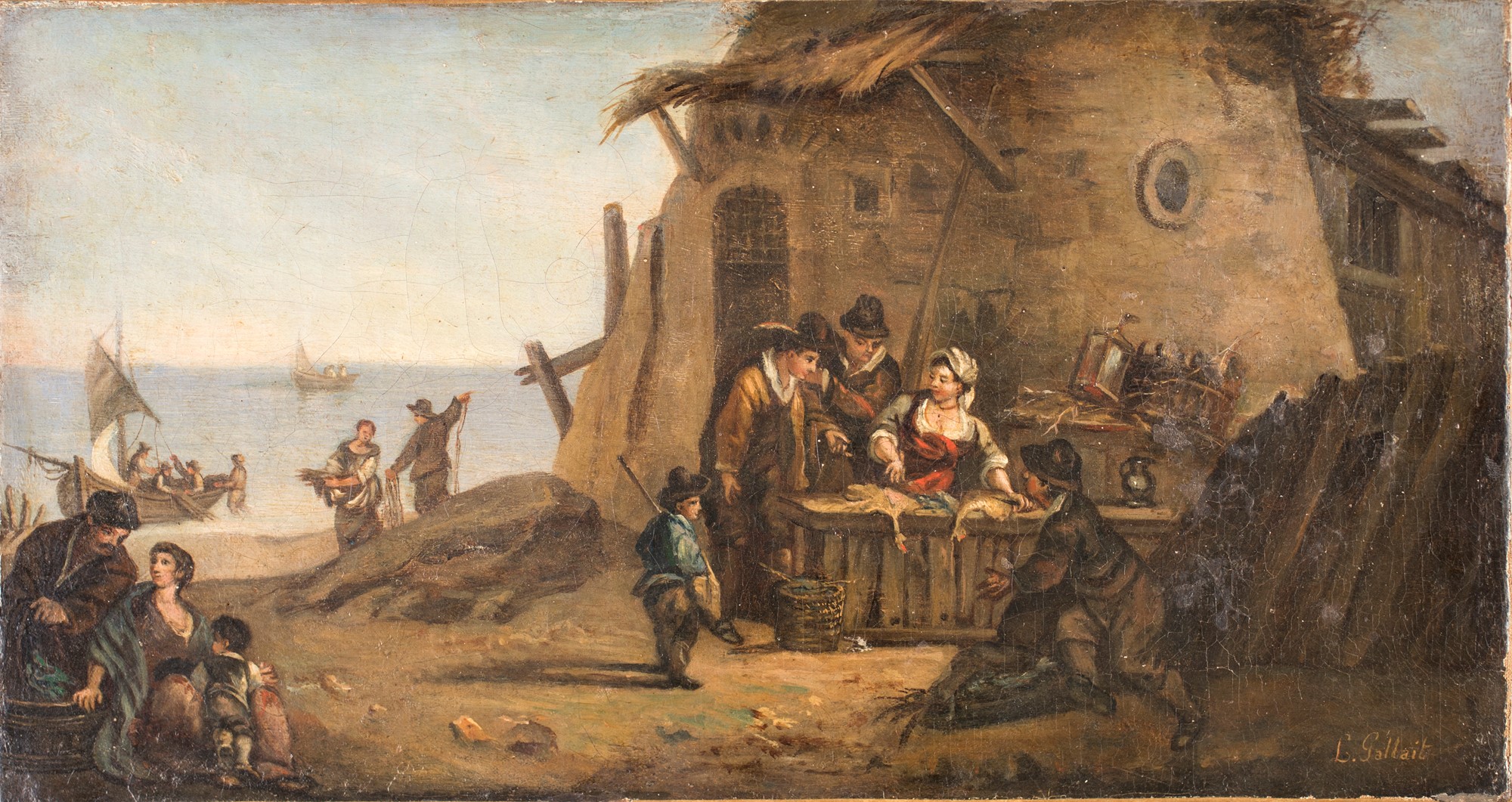 Louis Gallait Scorcio di villaggio con scena di mercato olio su tela cm 19x35...