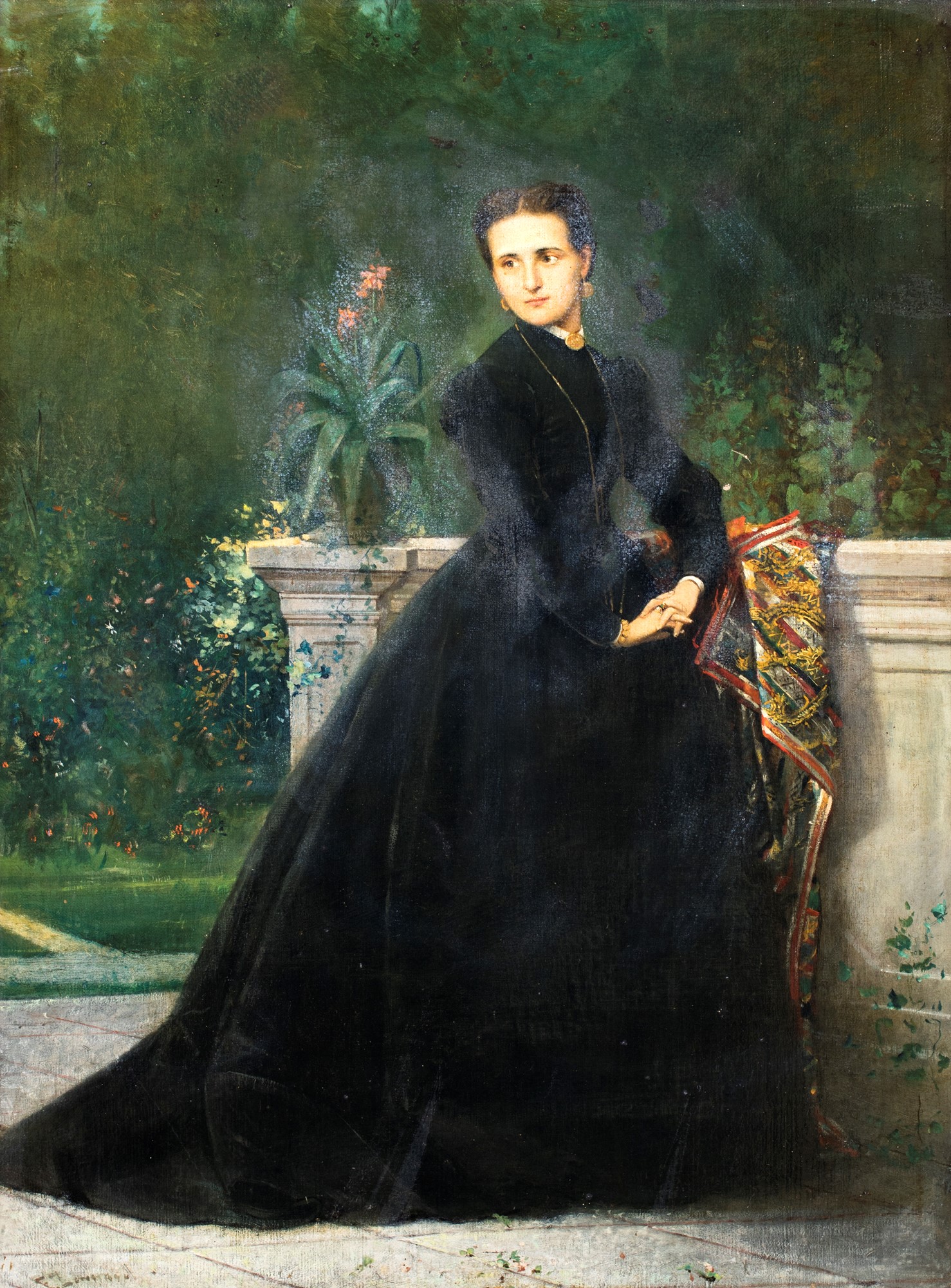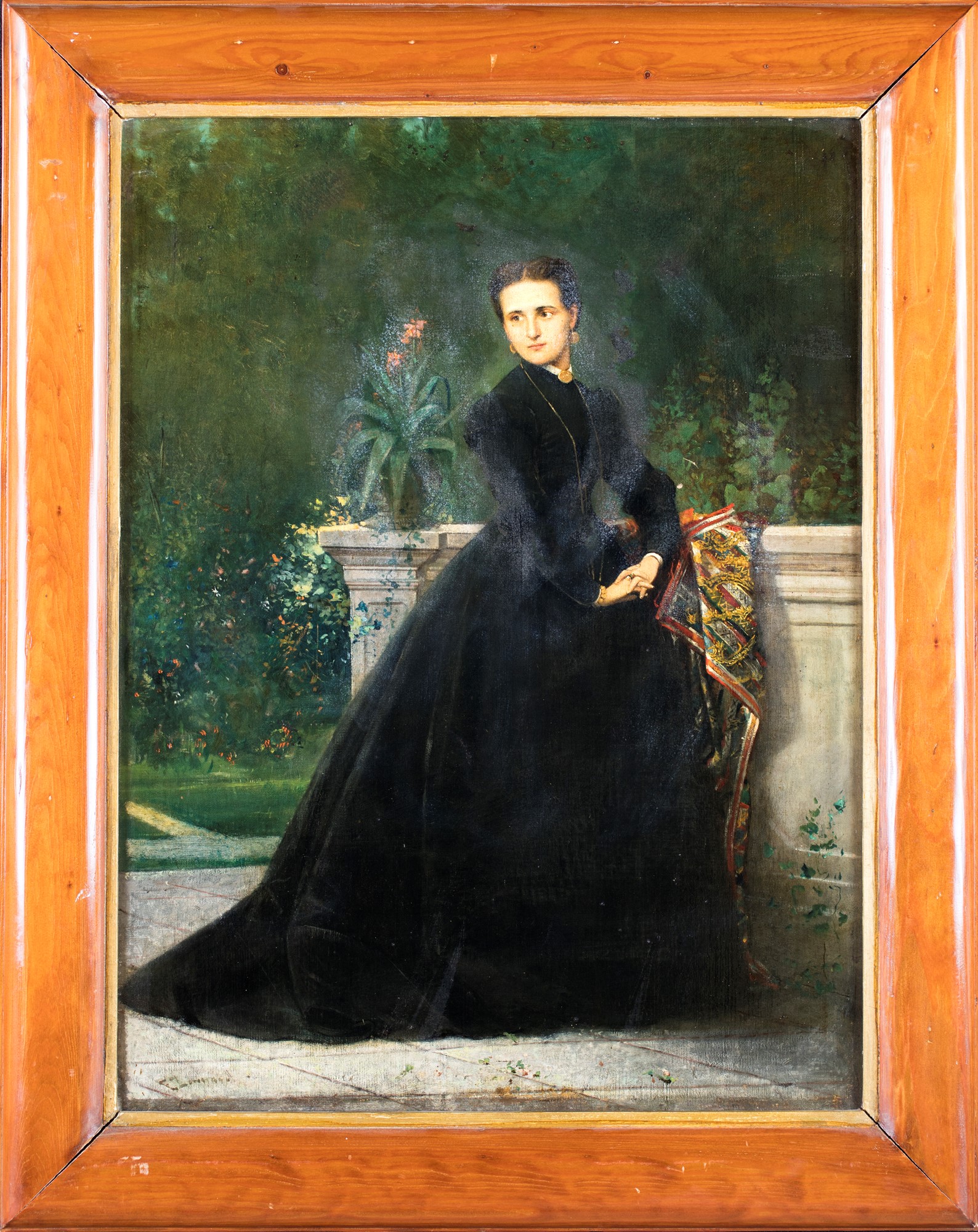 Lotto 54 | Pittore del XIX secolo Ritratto di giovane donna in un giardino olio su tela...