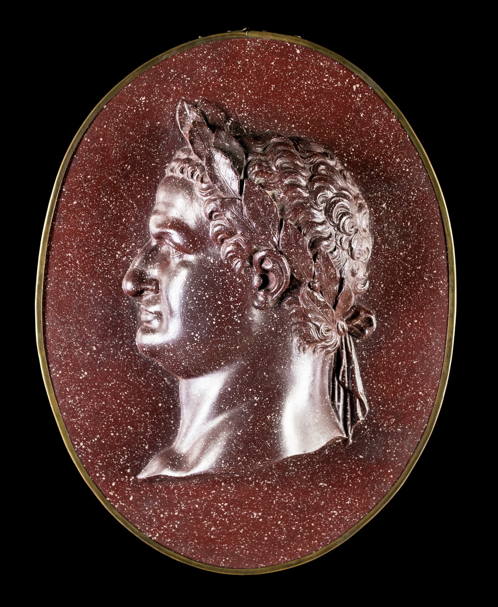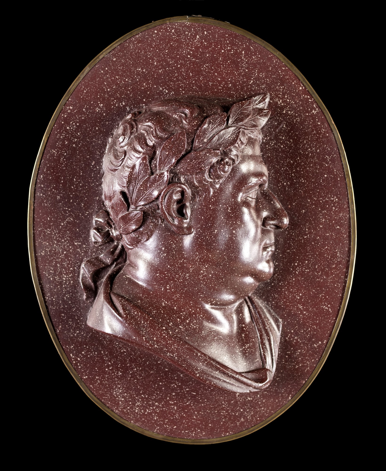 Coppia di grandi medaglioni a cameo in scagliola decorati ad imitazione del porfido, con profili degli imperatori Nerone e Traiano cm 42x32