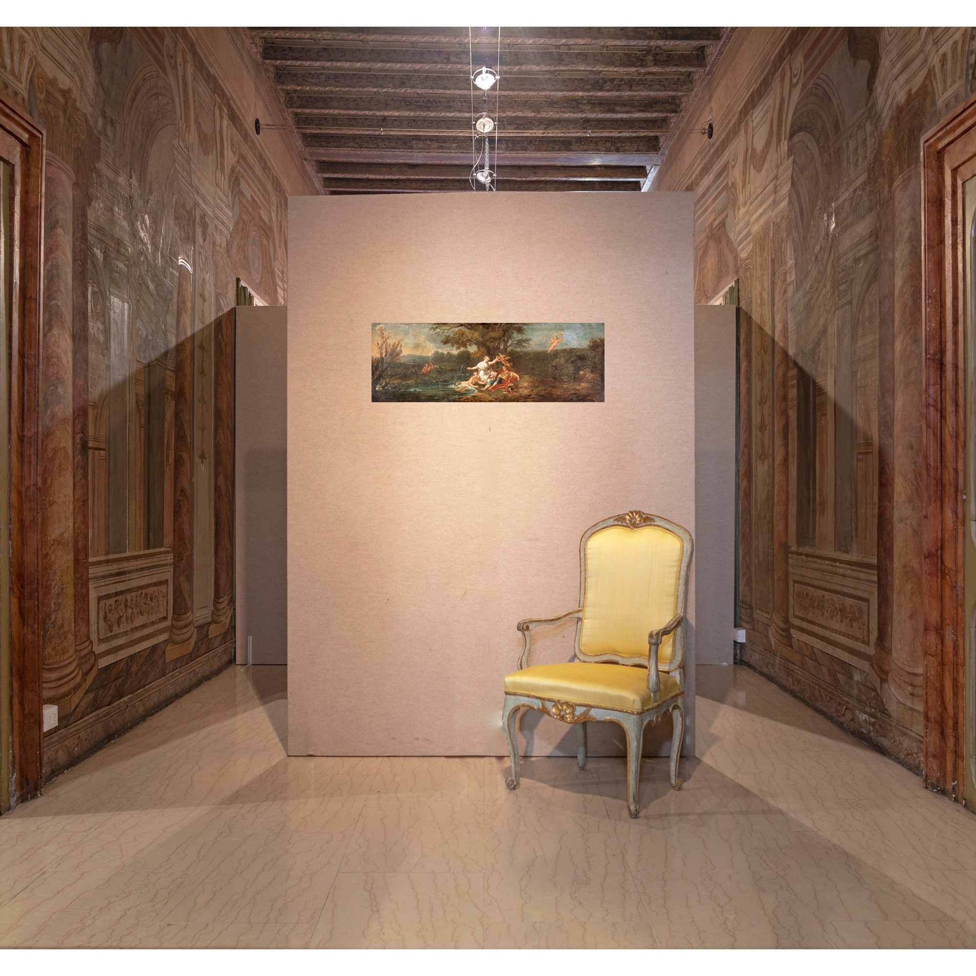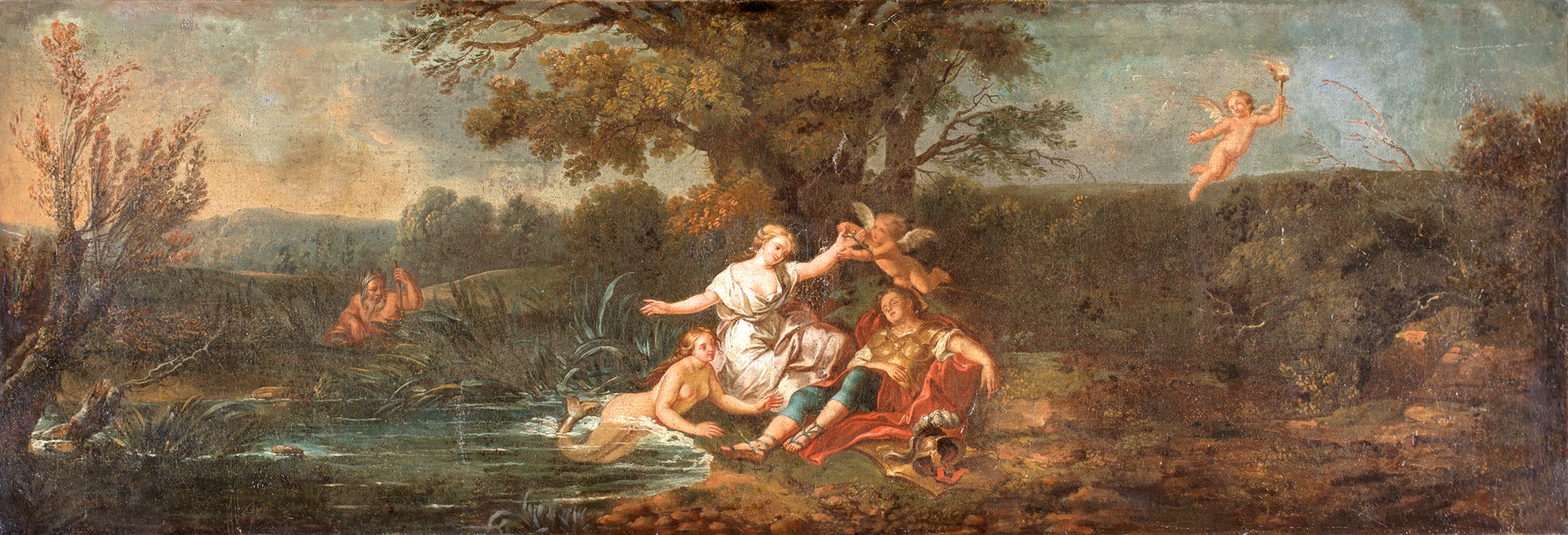 Pittore del XVIII secolo Paesaggio fluviale con Rinaldo e Armida olio su tela...