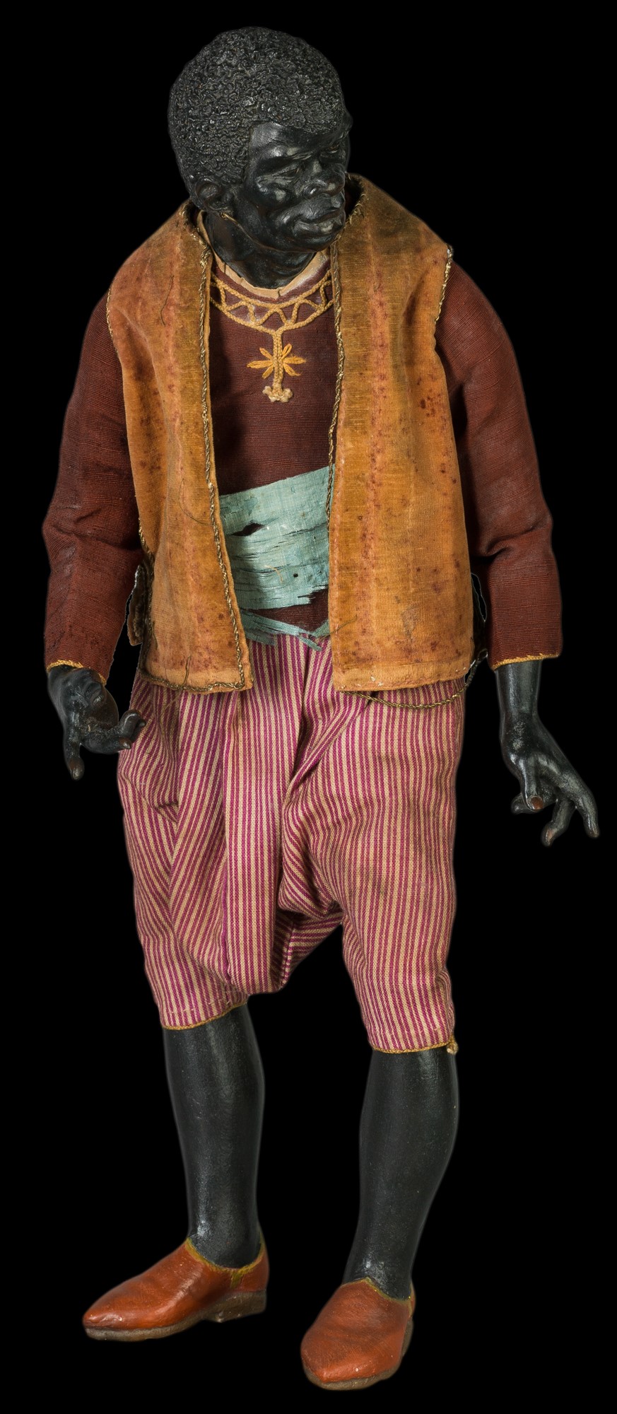 Servitore moro fusciacca grigia, gilet in pelle, pantaloni a righine, scarpe marroni. altezza cm 39