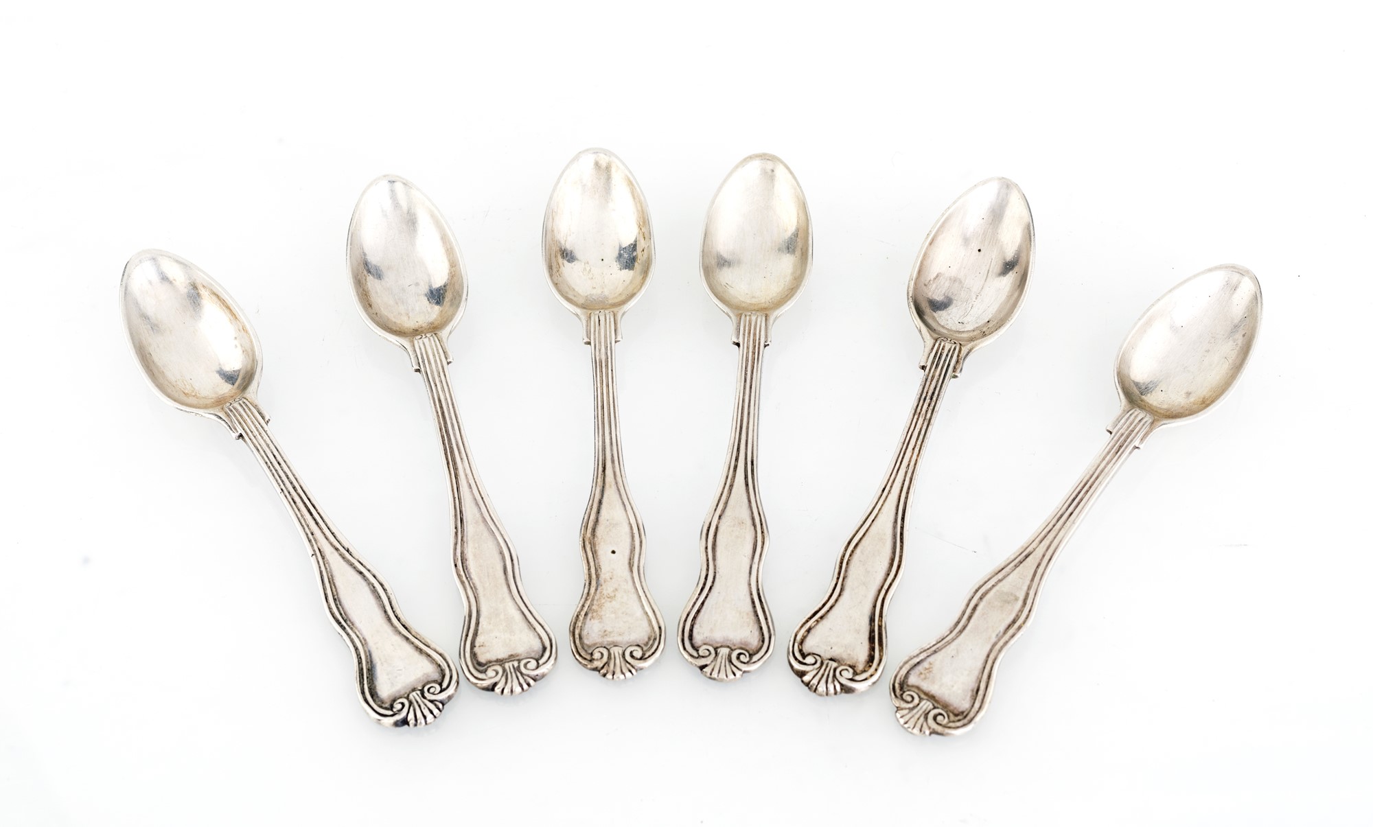 Sei cucchiaini in argento 833/1000, Napoli 1830 ca. con impugnatura dal profilo sagomato e vertice centrato da palmetta cm 14 - gr. 243