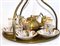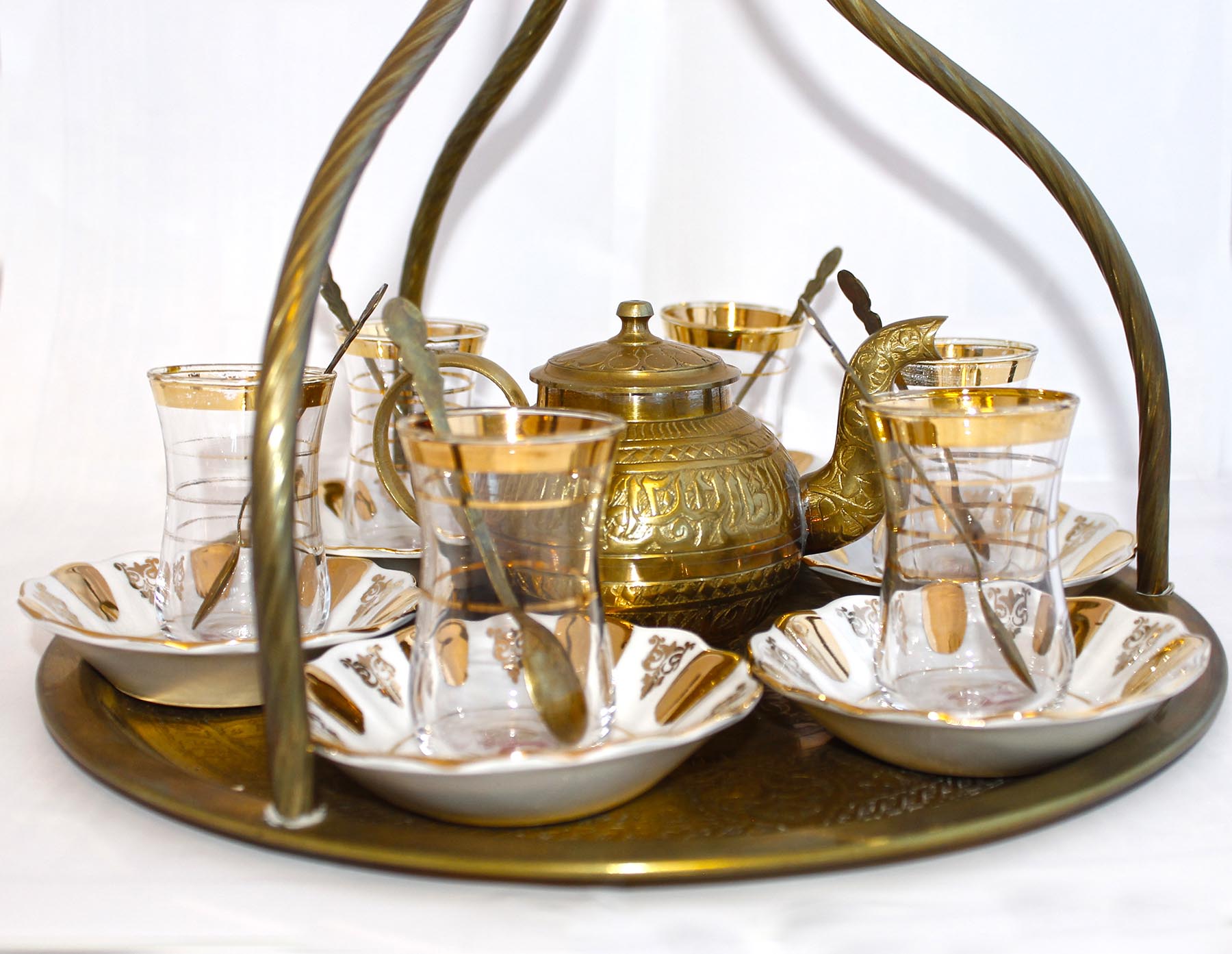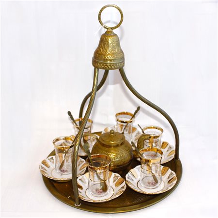composto da sei bicchierini in vetro, sei piattini in porcellana, sei cucchiaini, un vassoio in metallo dorato, una caffettiera