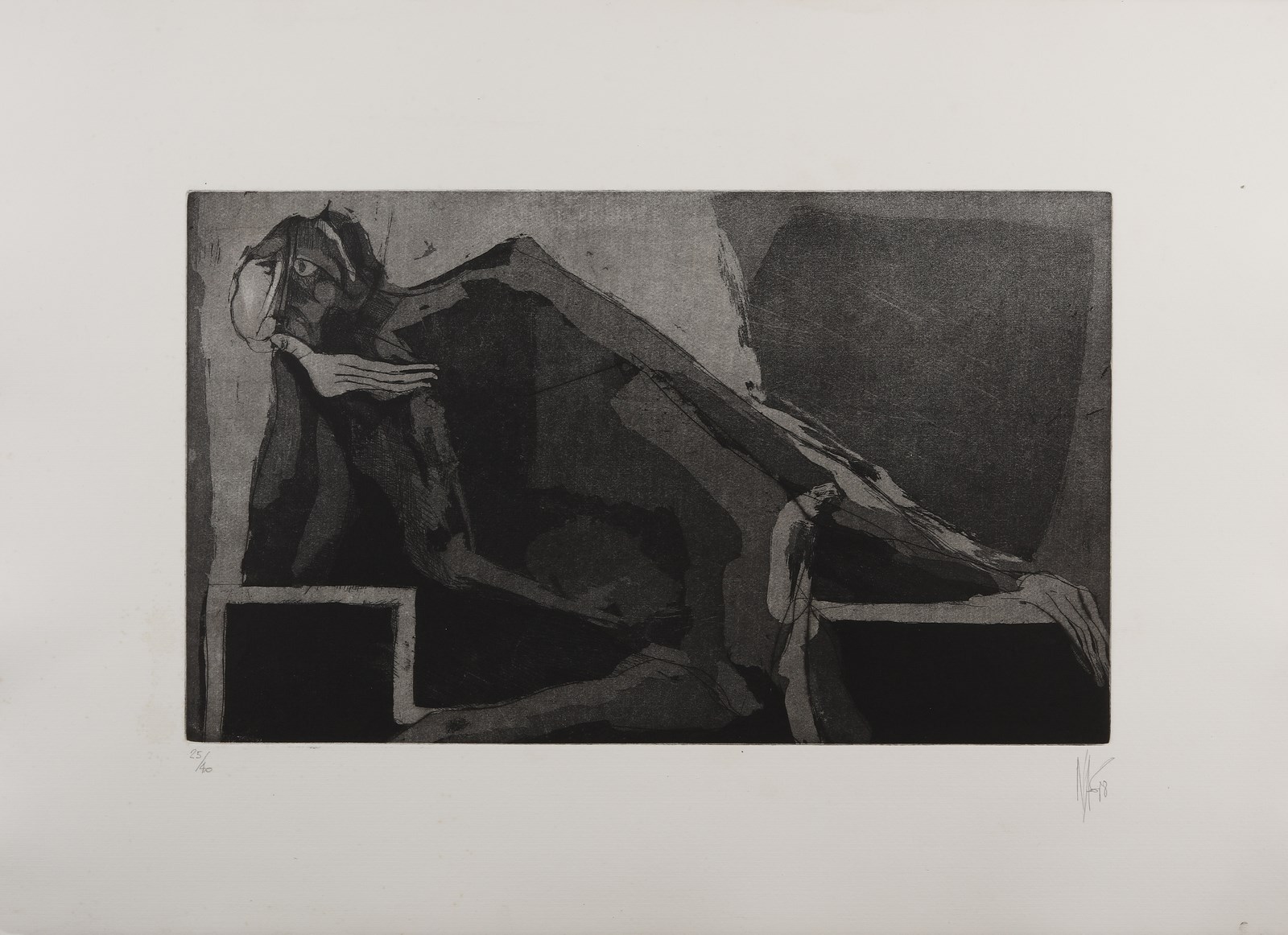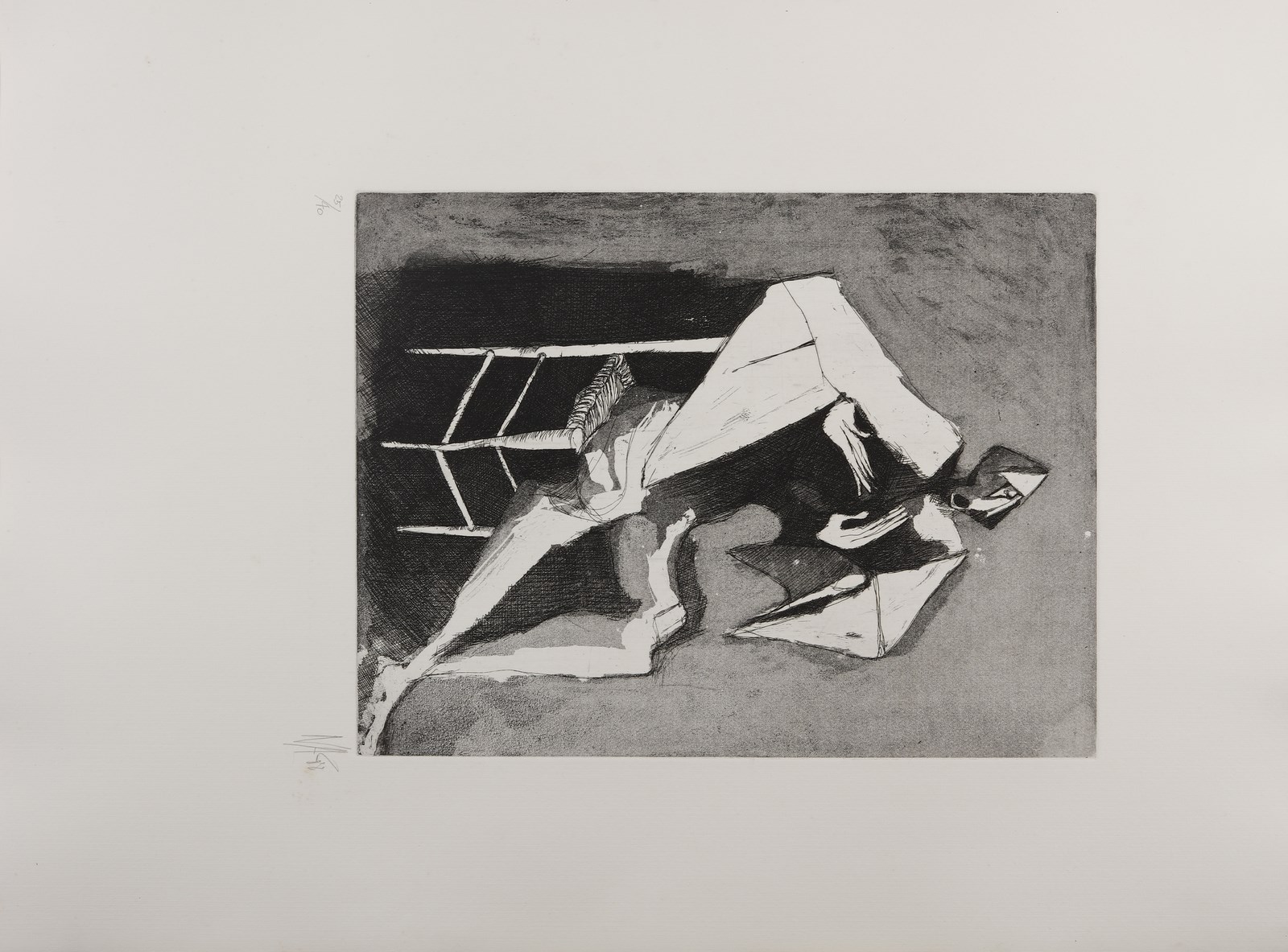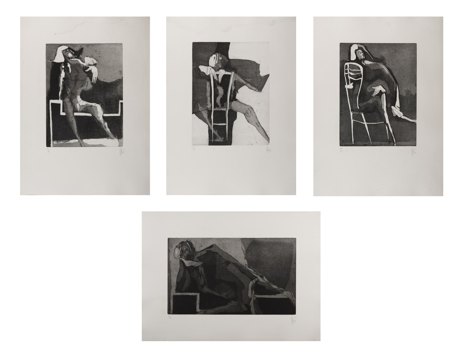 ARNOLDI NAG (n. 1928) Cartella composta da n.5 fogli. Gente seduta e odore di Circo. 1988. Acquaforte. Cm 50,00 x 70,00. 25/40. Ogni grafica presenta firma, tiratura e anno in basso a matita. Dimensione lastra: 39.5x29.5 cm; 29.5x49 cm. Difetti.